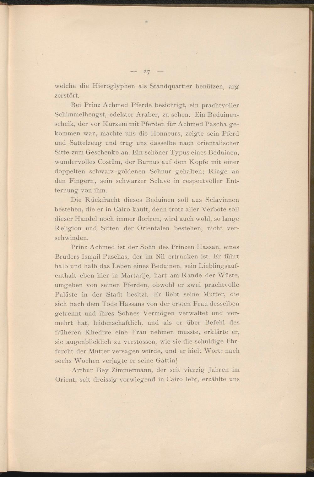 Prinz Achmed ist der Sohn des Prinzen Hassan, eines Bruders Ismail Paschas, der im Nil ertrunken ist. Er führt halb und halb das Leben eines Beduinen, sein Lieblingsaufenthalt eben hier in Martarije, hart am Rande der Wüste, umgeben von seinen Pferden, obwohl er zwei prachtvolle Paläste in der Stadt besitzt. Er liebt seine Mutter, die sich nach dem Tode Hassans von der ersten Frau desselben getrennt und ihres Sohnes Vermögen verwaltet und vermehrt hat, leidenschaftlich, und als er über Befehl des früheren Khedive eine Frau nehmen musste, erklärte er, sie augenblicklich zu verstossen, wde sie die schuldige Ehrfurcht der Mutter versagten würde, und er hielt Wort: nach sechs Wochen verjagte er seine Gattin!