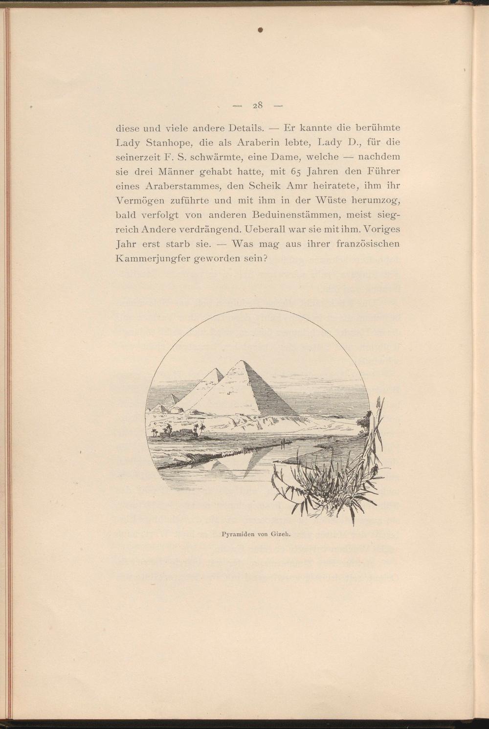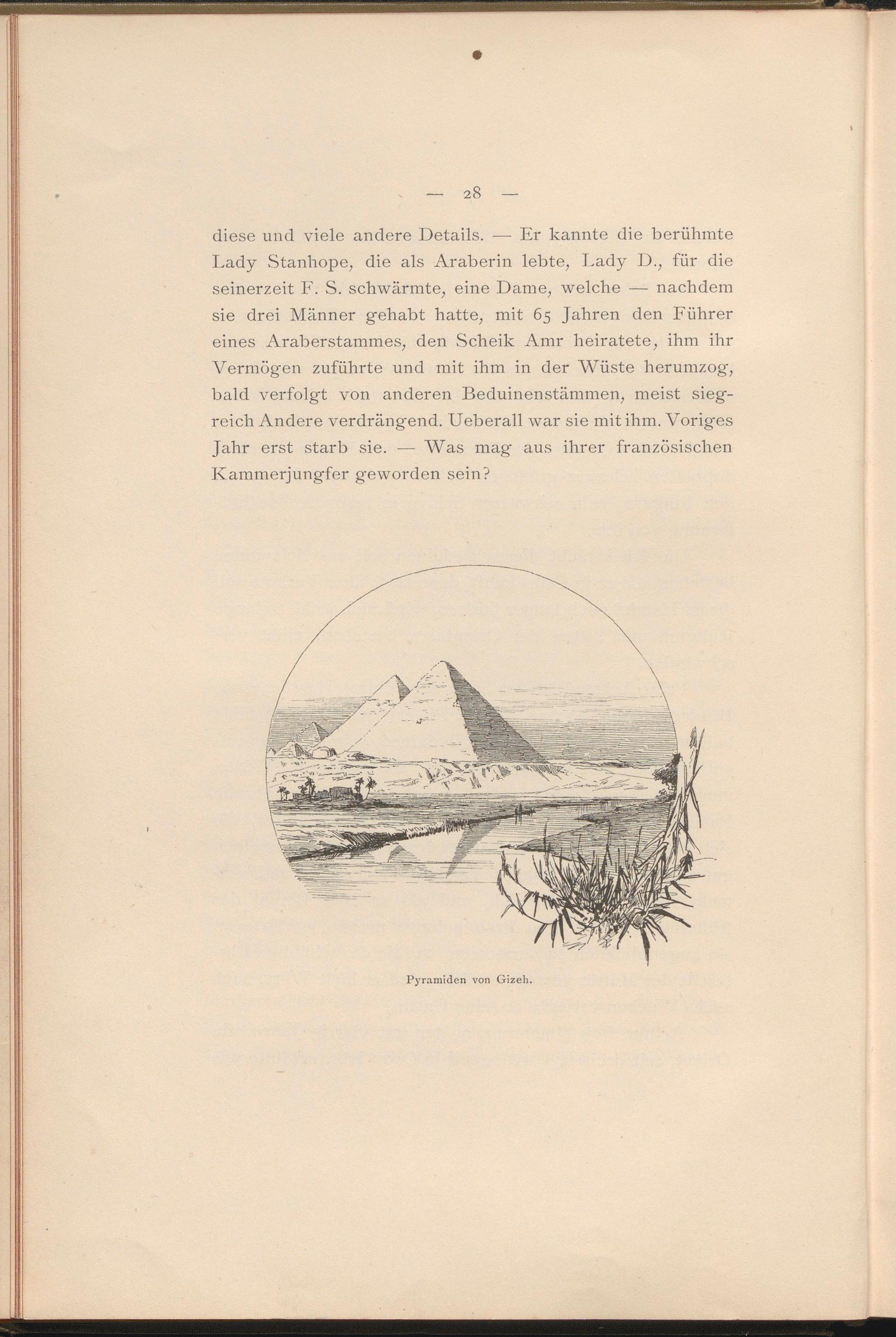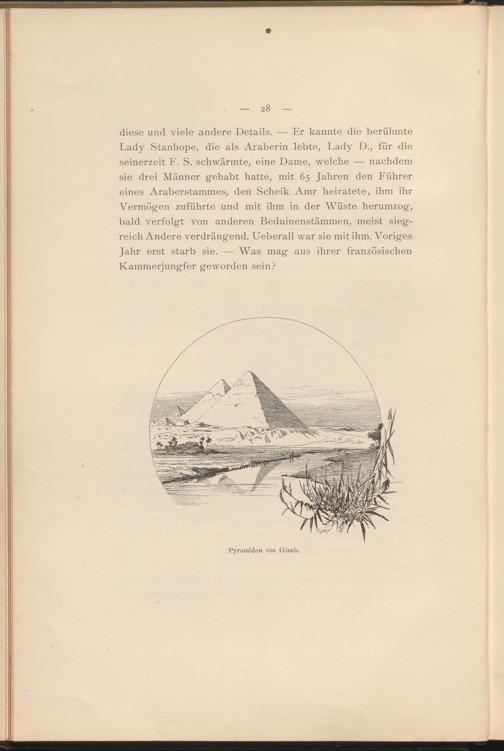 diese und viele andere Details. — Er kannte die berühmte Lady Stanhope, die als Araberin lebte, Lady D., für die seinerzeit F. S. schwärmte, eine Dame, welche — nachdem sie drei Männer gehabt hatte, mit 65 Jahren den Führer eines Araberstammes, den Scheik Amr heiratete, ihm ihr Vermögen zuführte und mit ihm in der Wüste herumzog, bald verfolgt von anderen Beduinenstämmen, meist siegreich Andere verdrängend. Ueberall war sie mit ihm. Voriges Jahr erst starb sie. — Was mag aus ihrer französischen Kammerjungfer geworden sein?