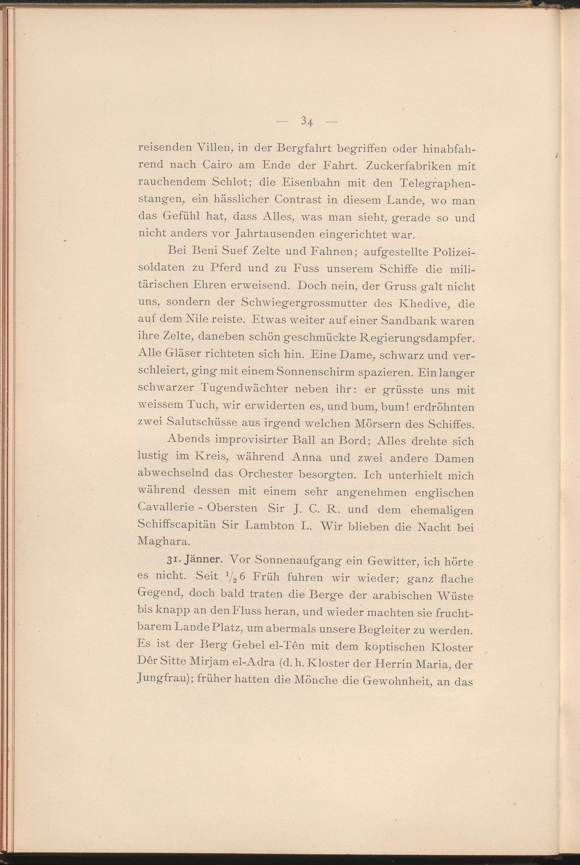 Abends improvisirter Ball an Bord; Alles drehte sich lustig im Kreis, während Anna und zwei andere Damen abwechselnd das Orchester besorgten. Ich unterhielt mich während dessen mit einem sehr angenehmen englischen Cavallerie - Obersten Sir J. C. R. und dem ehemaligen Schiffscapitän Sir Lambton L. Wir blieben die Nacht bei Maghara.