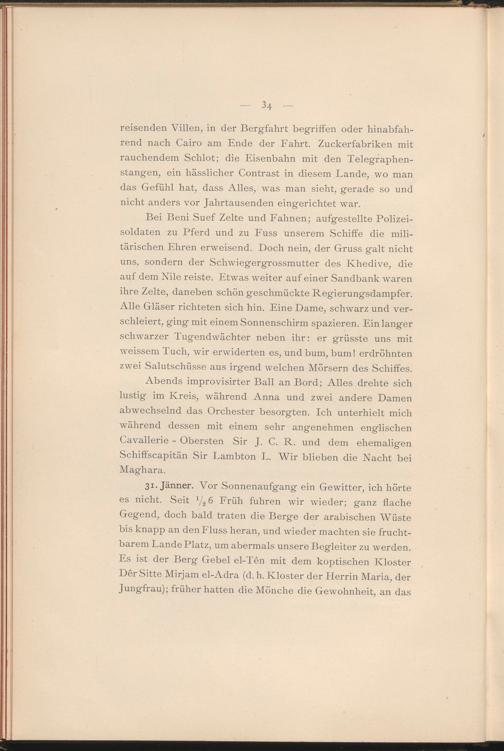 31. Jänner. Vor Sonnenaufgang ein Gewitter, ich hörte es nicht. Seit 1 / 2 6 Früh fuhren wir wieder; ganz flache Gegend, doch bald traten die Berge der arabischen Wüste bis knapp an den Fluss heran, und wieder machten sie fruchtbarem Lande Platz, um abermals unsere Begleiter zu w erden. Es ist der Berg Gebel el-Ten mit dem koptischen Kloster Der Sitte Mirjam el-Adra (d. h. Kloster der Herrin Maria, der Jungfrau); früher hatten die Mönche die Gewohnheit, an das