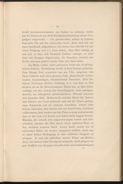 An Minje vorbei, einer grösseren Stadt mit vicekönig- lichem Schloss. Nachmittag wurde in Beni Hassan gelandet. Eine Menge Esel erwartete uns am Ufer, umgeben von ihren Führern und einer grossen Zahl „Bakschisch“ erwartender, blauhemdiger, braunfarbener Burschen. Drei berittene Polizisten hielten Ordnung, d. h. von Zeit zu Zeit theilten sie an die Menschenmasse Hiebe aus, so dass diese, verfolgt von den Armen der Gerechtigkeit, weit auseinanderstob, um allsogleich zurückzukehren. Hierauf erneuert sich dasselbe Bild. Mittlerweile wurden Sättel für Damen und Herren ans Land gebracht und auf die Thiere gelegt, ohne Rücksicht auf die Grössen derselben. Daher viele heitere Episoden; hier drehte sich ein Sattel beim Aufsitzen vollkommen, dort wieder war das Thier so jung und schwach, dass es die Last von Reiter und Sattel nicht tragen konnte. Manche, die schnell sich aufgeschwungen hatten und fortzottelten, büssten die Eile durch einen späteren Sturz in den weichen warmen Sand. Anna hatte zuerst ein zu schwaches Thier, ein zweites entsprach leidlich, doch war es unter keiner Bedingung in eine schärfere Gangart zu bringen. N. und ich schleiften unsere Füsse am Boden, denn wir hatten reine Zwergesel erhascht, doch gingen sie gut. Endlich war die ganze Gesellschaft nach halbstündigem