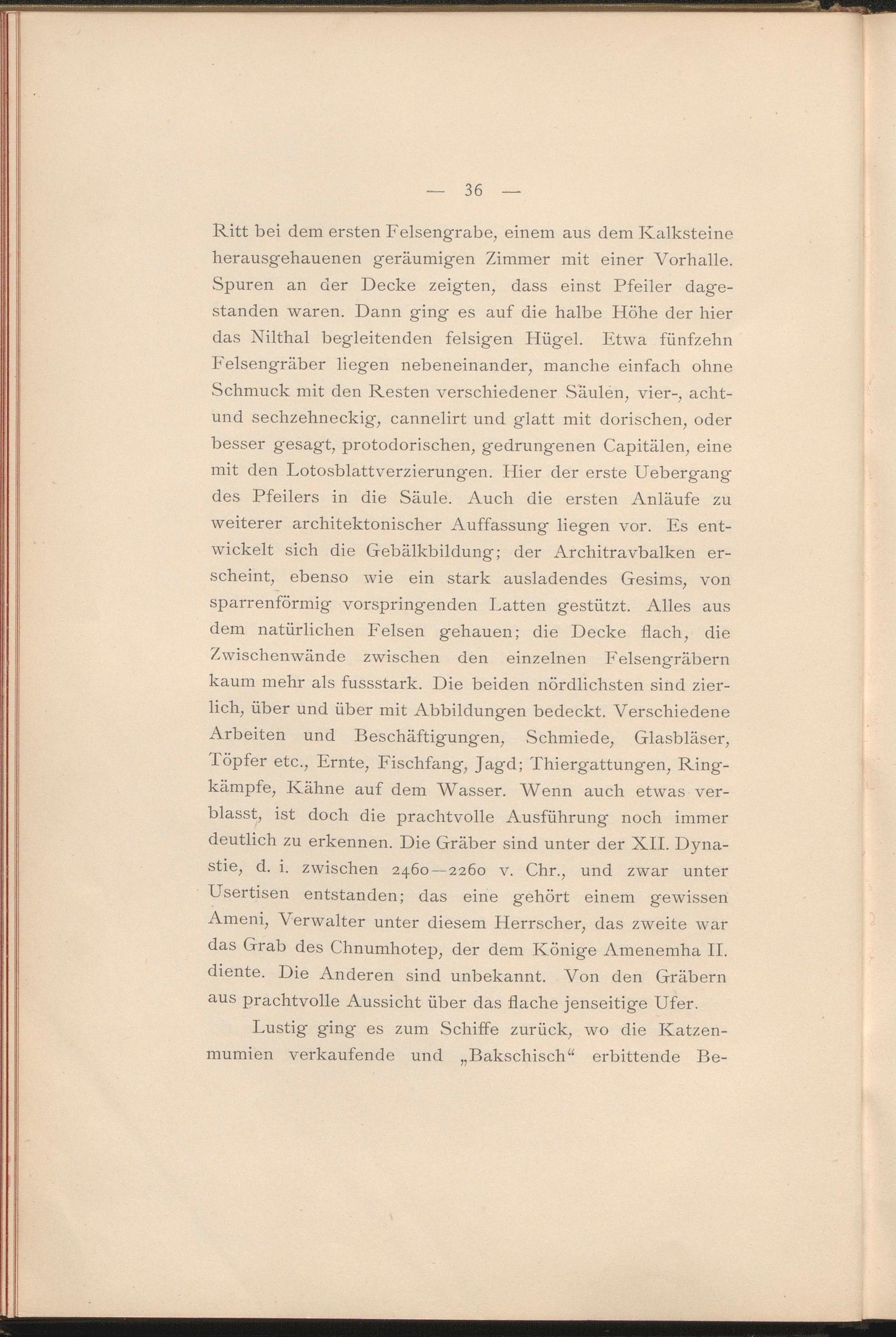 Ritt bei dem ersten Felsengrabe, einem aus dem Kalksteine herausgehauenen geräumigen Zimmer mit einer Vorhalle. Spuren an der Decke zeigten, dass einst Pfeiler dagestanden waren. Dann ging es auf die halbe Höhe der hier das Nilthal begleitenden felsigen Hügel. Etwa fünfzehn Felsengräber liegen nebeneinander, manche einfach ohne Schmuck mit den Resten verschiedener Säulen, vier-, acht- und sechzehneckig, cannelirt und glatt mit dorischen, oder besser gesagt, protodorischen, gedrungenen Capitälen, eine mit den Lotosblattverzierungen. Hier der erste Uebergang des Pfeilers in die Säule. Auch die ersten Anläufe zu weiterer architektonischer Auffassung liegen vor. Es entwickelt sich die Gebälkbildung; der Architravbalken erscheint, ebenso wie ein stark ausladendes Gesims, von sparrenförmig vorspringenden Latten gestützt. Alles aus dem natürlichen Felsen gehauen; die Decke flach, die Zwischenwände zwischen den einzelnen Felsengräbern kaum mehr als fussstark. Die beiden nördlichsten sind zierlich, über und über mit Abbildungen bedeckt. Verschiedene Arbeiten und Beschäftigungen, Schmiede, Glasbläser, Töpfer etc., Ernte, Fischfang, Jagd; Thiergattungen, Ringkämpfe, Kähne auf dem Wasser. Wenn auch etwas verblasst, ist doch die prachtvolle Ausführung- noch immer deutlich zu erkennen. Die Gräber sind unter der XII. Dynastie, d. i. zwischen 2460—2260 v. Chr., und zwar unter Usertisen entstanden; das eine gehört einem gewissen Ameni, Verwalter unter diesem Herrscher, das zweite war das Grab des Chnumhotep, der dem Könige Amenemha II. diente. Die Anderen sind unbekannt. Von den Gräbern a us prachtvolle Aussicht über das flache jenseitige Ufer.