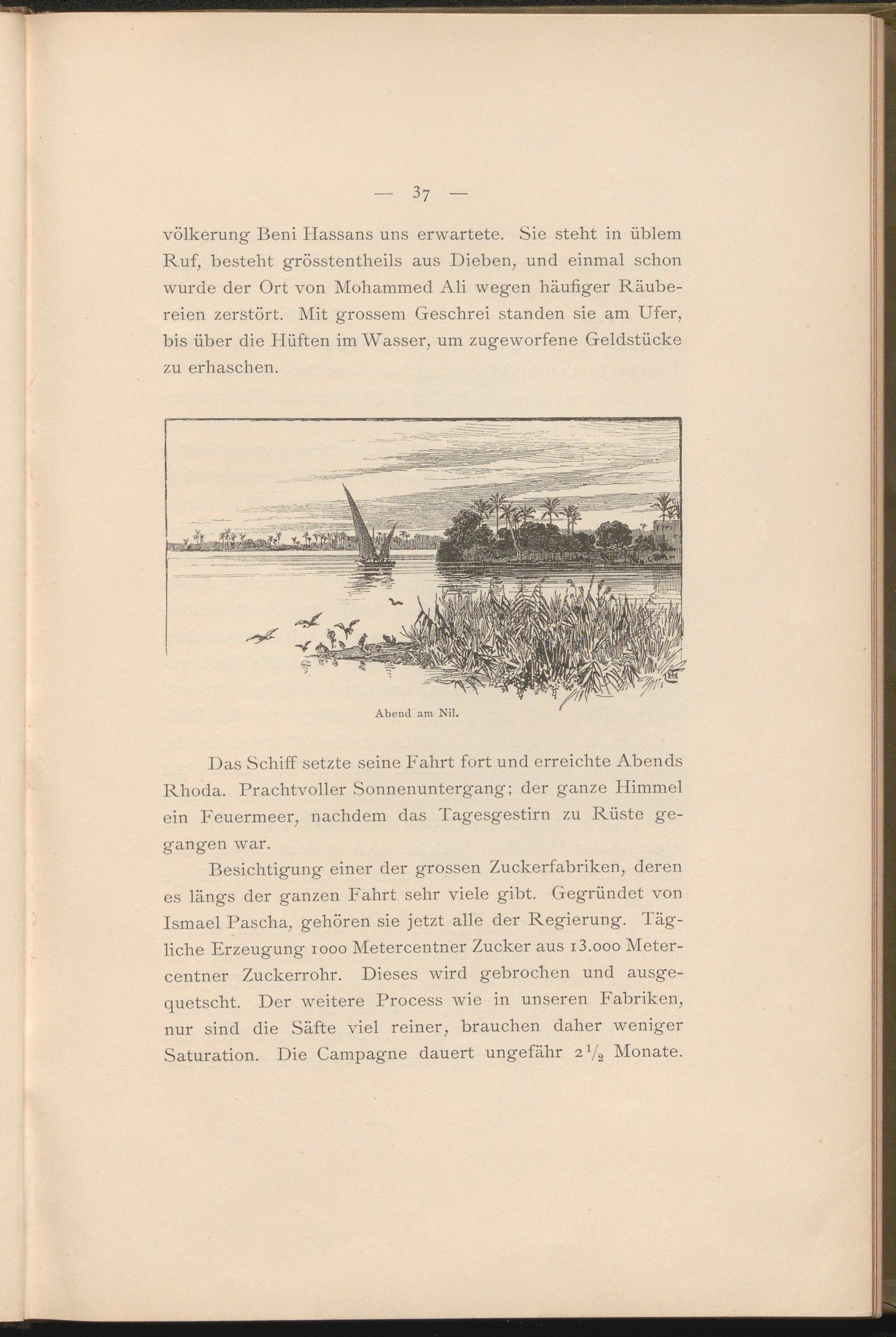 Besichtigung einer der grossen Zuckerfabriken, deren es längs der ganzen Fahrt sehr viele gibt. Gegründet von Ismael Pascha, gehören sie jetzt alle der Regierung. Tägliche Erzeugung 1000 Metercentner Zucker aus i 3 .ooo Meter- centner Zuckerrohr. Dieses wird gebrochen und ausgequetscht. Der weitere Process wie in unseren Fabriken, nur sind die Säfte viel reiner, brauchen daher weniger Saturation. Die Campagne dauert ungefähr 2 x / 2 Monate.