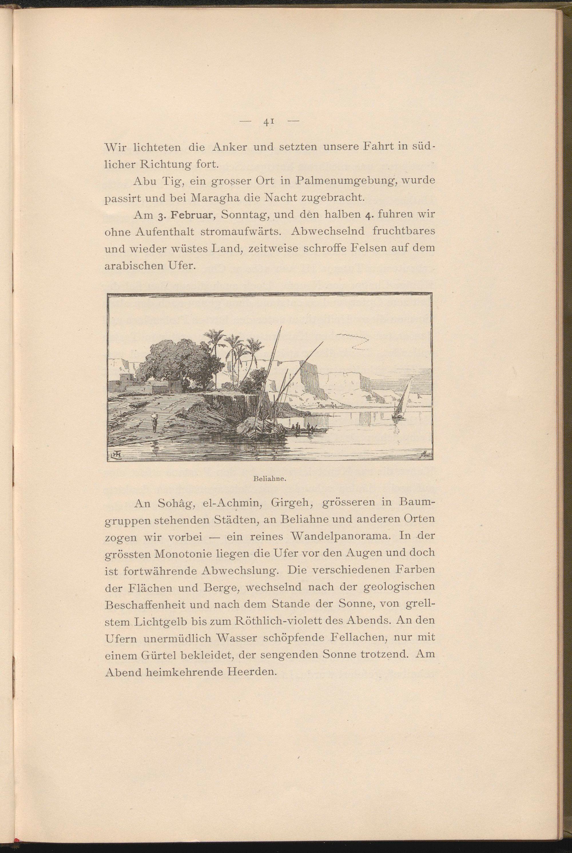 An Sohäg, el-Achmin, Girgeh, grösseren in Baumgruppen stehenden Städten, an Beliahne und anderen Orten zogen wir vorbei ■— ein reines Wandelpanorama. In der grössten Monotonie liegen die Ufer vor den Augen und doch ist fortwährende Abwechslung. Die verschiedenen Farben der Flächen und Berge, wechselnd nach der geologischen Beschaffenheit und nach dem Stande der Sonne, von grellstem Lichtgelb bis zum Röthlich-violett des Abends. An den Ufern unermüdlich Wasser schöpfende Fellachen, nur mit einem Gürtel bekleidet, der sengenden Sonne trotzend. Am Abend heimkehrende Heerden.