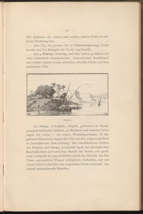 Am 3. Februar, Sonntag, und den halben 4. fuhren wir ohne Aufenthalt stromaufwärts. Abwechselnd fruchtbares und wieder wüstes Land, zeitweise schroffe Felsen auf dem arabischen Ufer.