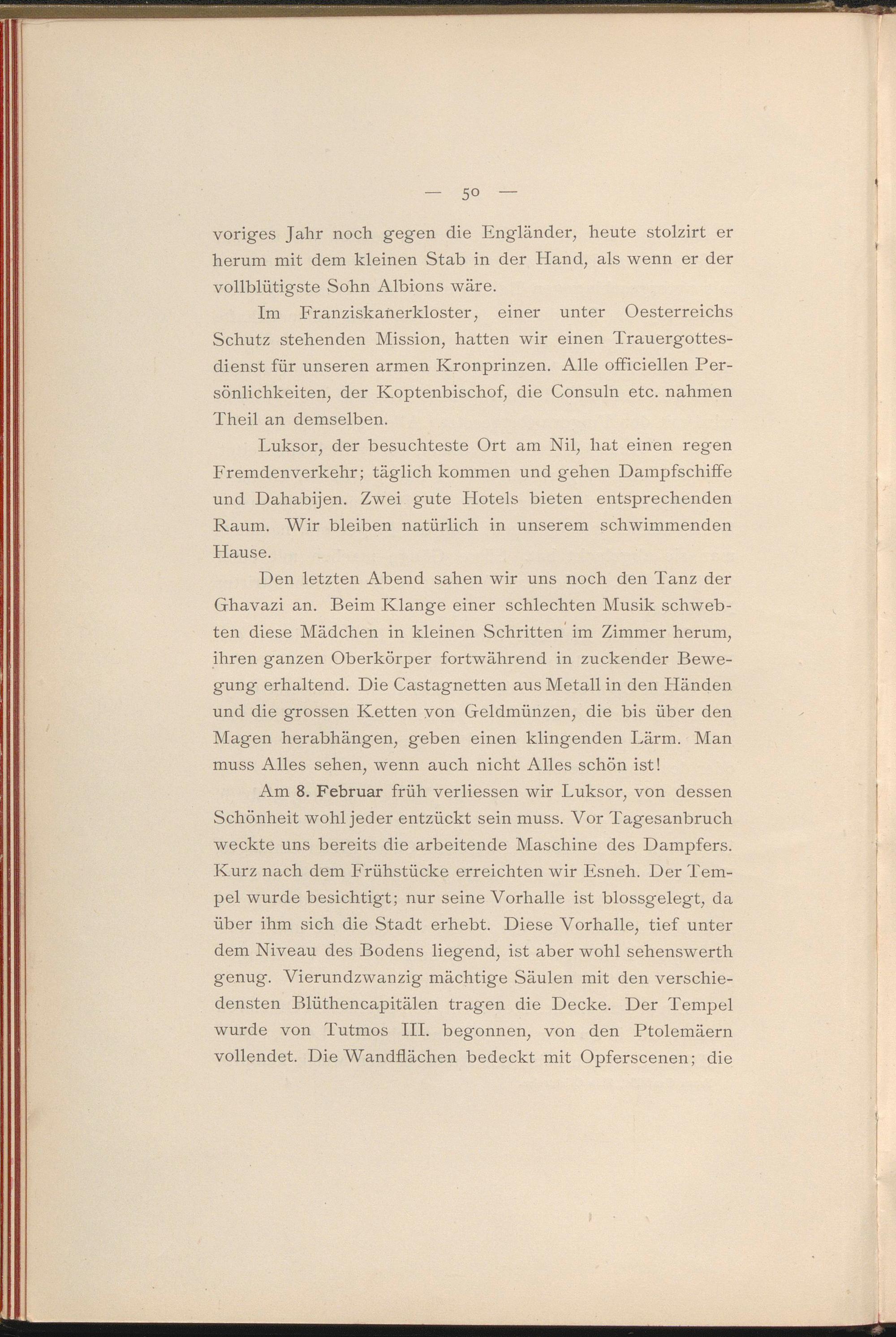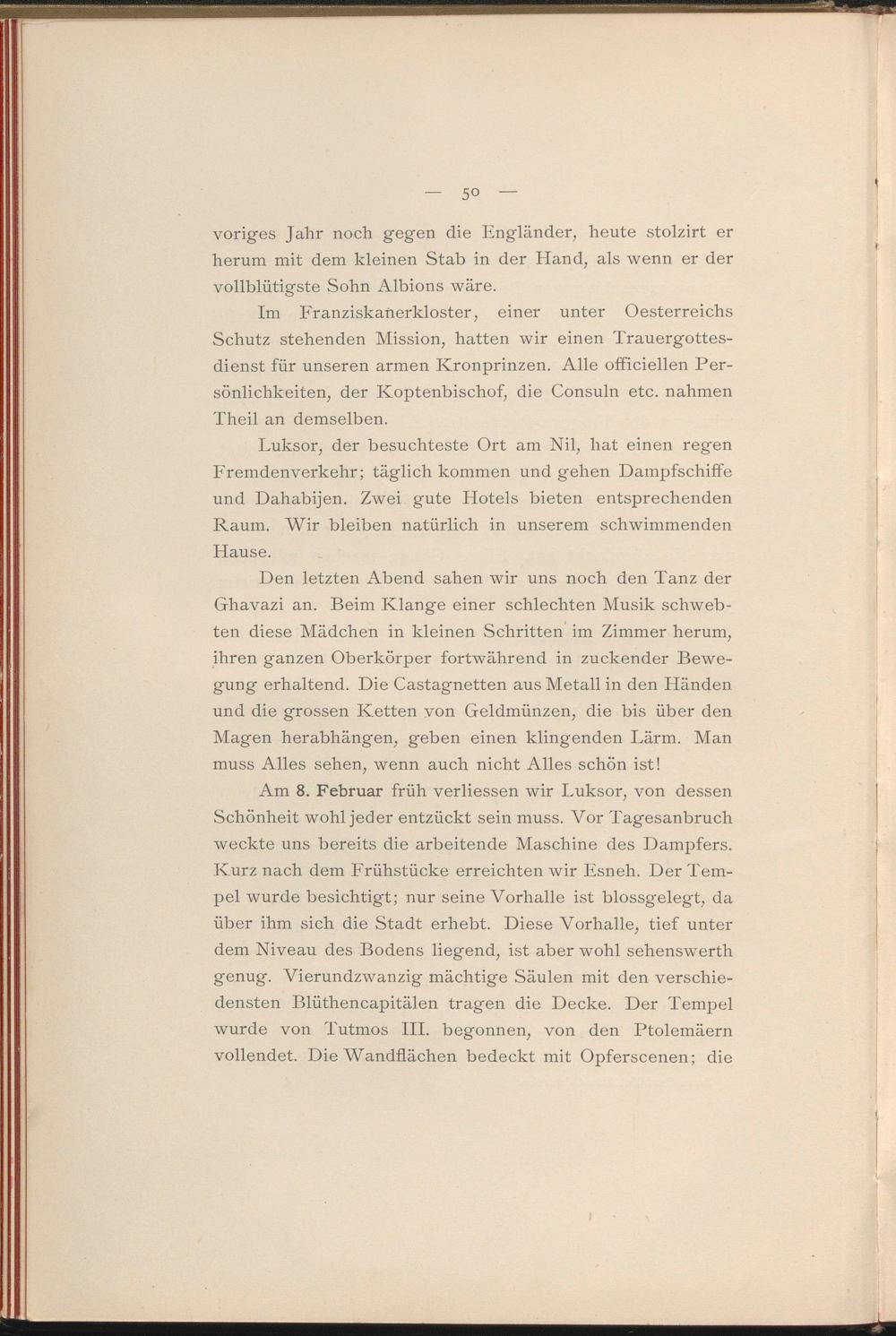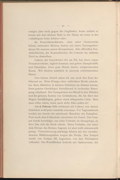 Am 8. Februar früh verliessen wir Luksor, von dessen Schönheit wohl jeder entzückt sein muss. A^or Tagesanbruch weckte uns bereits die arbeitende Maschine des Dampfers. Kurz nach dem Frühstücke erreichten wir Esneh. Der Tempel wurde besichtigt; nur seine Vorhalle ist blossgelegt, da über ihm sich die Stadt erhebt. Diese Vorhalle, tief unter dem Niveau des Bodens liegend, ist aber wohl sehenswerth genug. Vierundzwanzig mächtige Säulen mit den verschiedensten Blüthencapitälen tragen die Decke. Der Tempel wurde von Tutmos III. begonnen, von den Ptolemäern vollendet. Die Wandflächen bedeckt mit Opferscenen; die