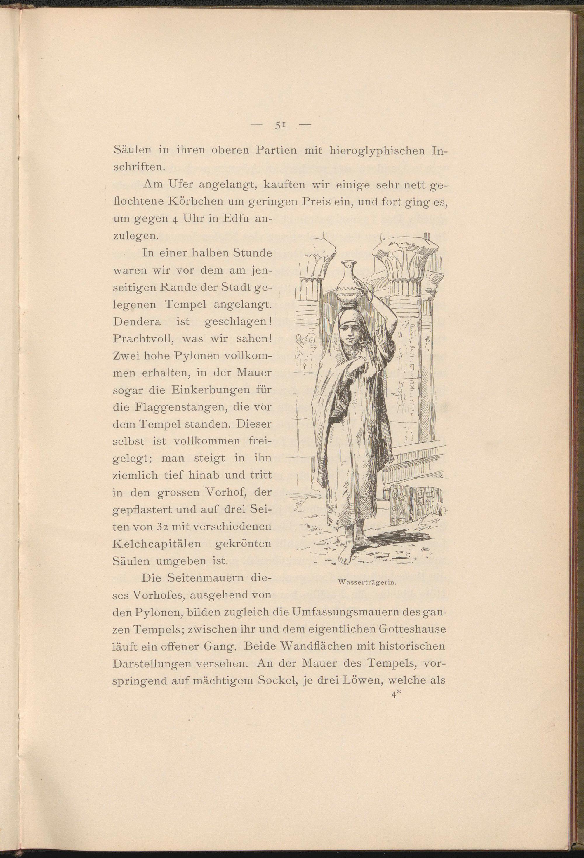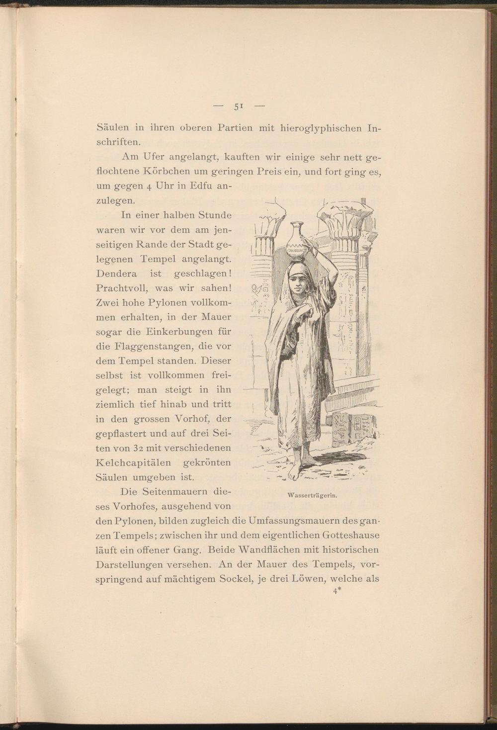 In einer halben Stunde waren wir vor dem am jenseitigen Rande der Stadt gelegenen Tempel angelangt. Dendera ist geschlagen! Prachtvoll, was wir sahen! Zwei hohe Pylonen vollkommen erhalten, in der Mauer sogar die Einkerbungen für die Flaggenstangen, die vor dem Tempel standen. Dieser selbst ist vollkommen freigelegt; man steigt in ihn ziemlich tief hinab und tritt in den grossen Yorhof, der gepflastert und auf drei Seiten von 32 mit verschiedenen Kelchcapitälen gekrönten Säulen umgeben ist.