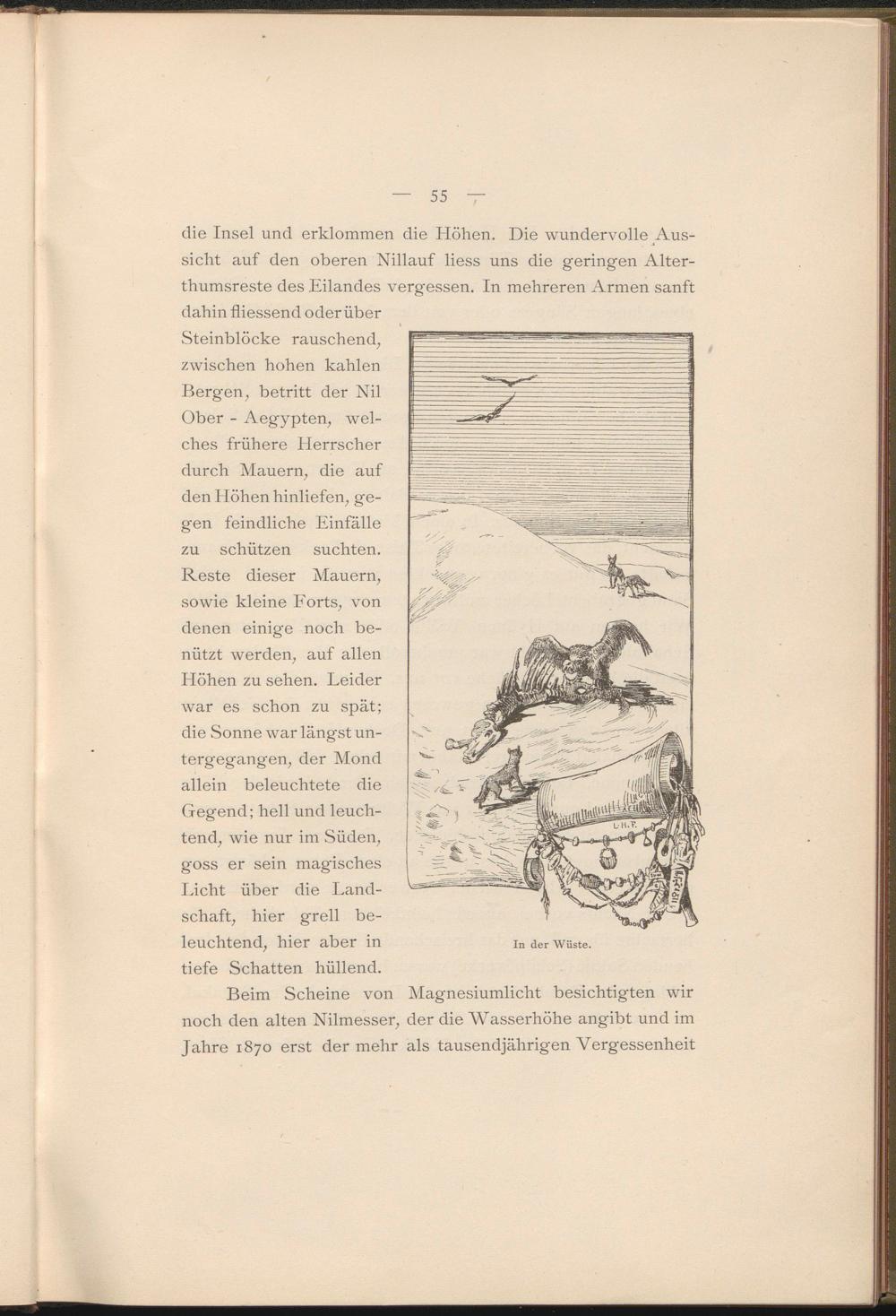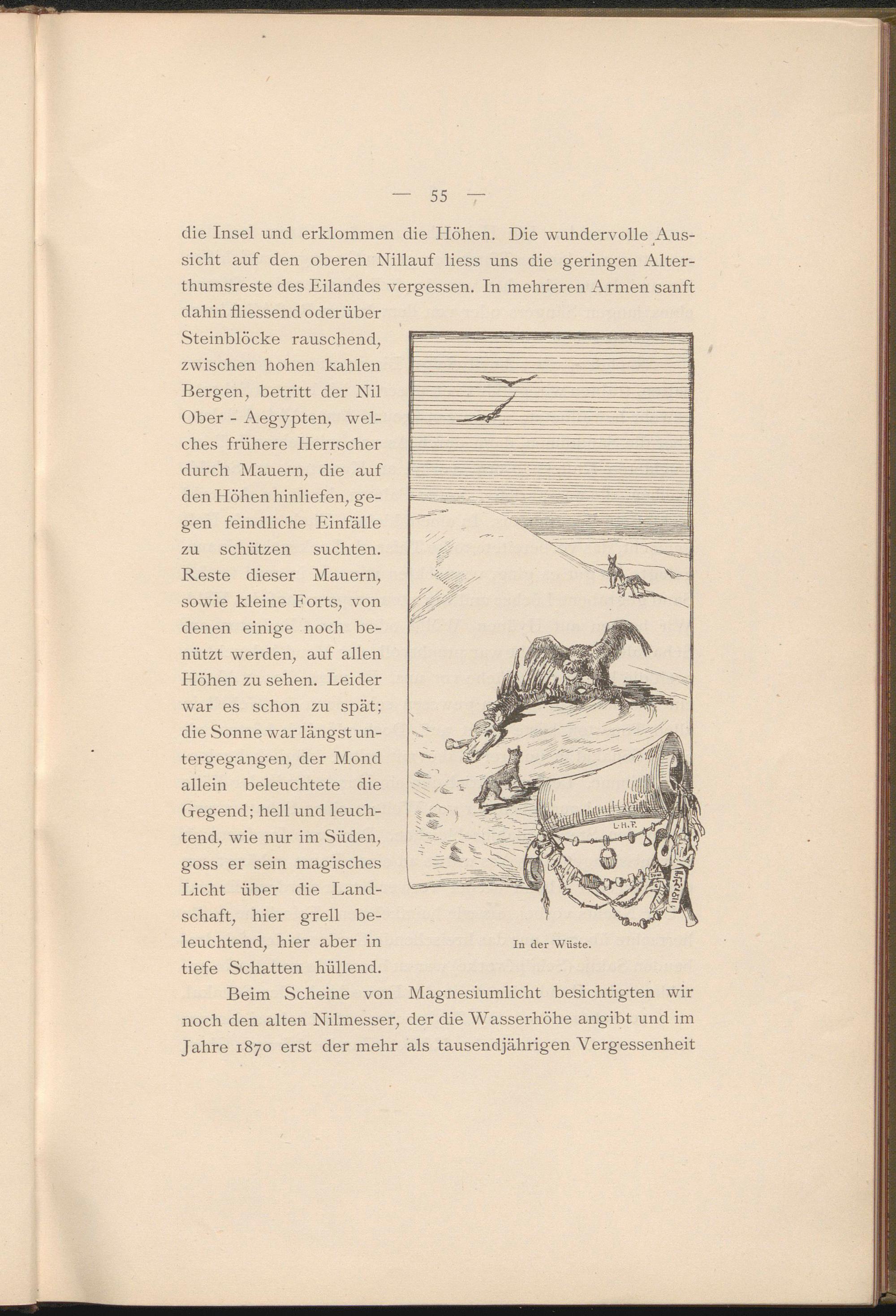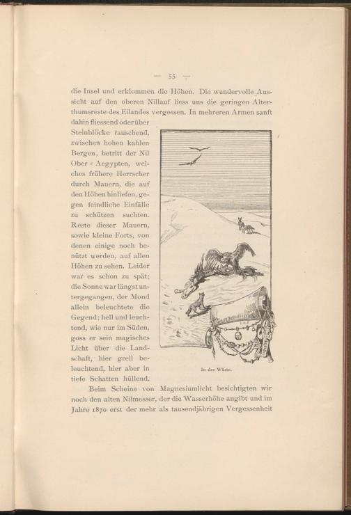 die Insel und erklommen die Höhen. Die wundervolle Aussicht auf den oberen Nillauf liess uns die geringen Alterthumsreste des Eilandes vergessen. In mehreren Armen sanft dahin fliessend oder über Steinblöcke rauschend, zwischen hohen kahlen Bergen, betritt der Nil Ober - Aegypten, welches frühere Herrscher durch Mauern, die auf den Höhen hinliefen, gegen feindliche Einfälle zu schützen suchten.