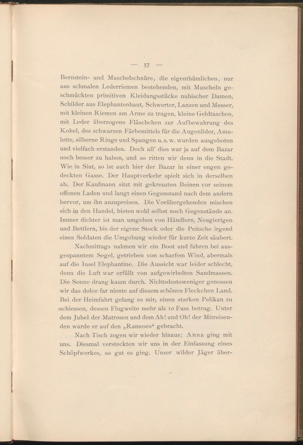 Nachmittags nahmen wir ein Boot und fuhren bei ausgespanntem Segel, getrieben von scharfem Wind, abermals auf die Insel Elephantine. Die Aussicht war leider schlecht, denn die Luft war erfüllt von aufgewirbelten Sandmassen. Die Sonne drang kaum durch. Nichtsdestoweniger genossen wir das dolce far niente auf diesem schönen Fleckchen Land. Bei der Heimfahrt gelang es mir, einen starken Pelikan zu ischiessen, dessen Flugweite mehr als ioFuss betrug. Unter dem Jubel der Matrosen und dem Ah! und Oh! der Mitreisenden wurde er auf den „Rameses“ gebracht.