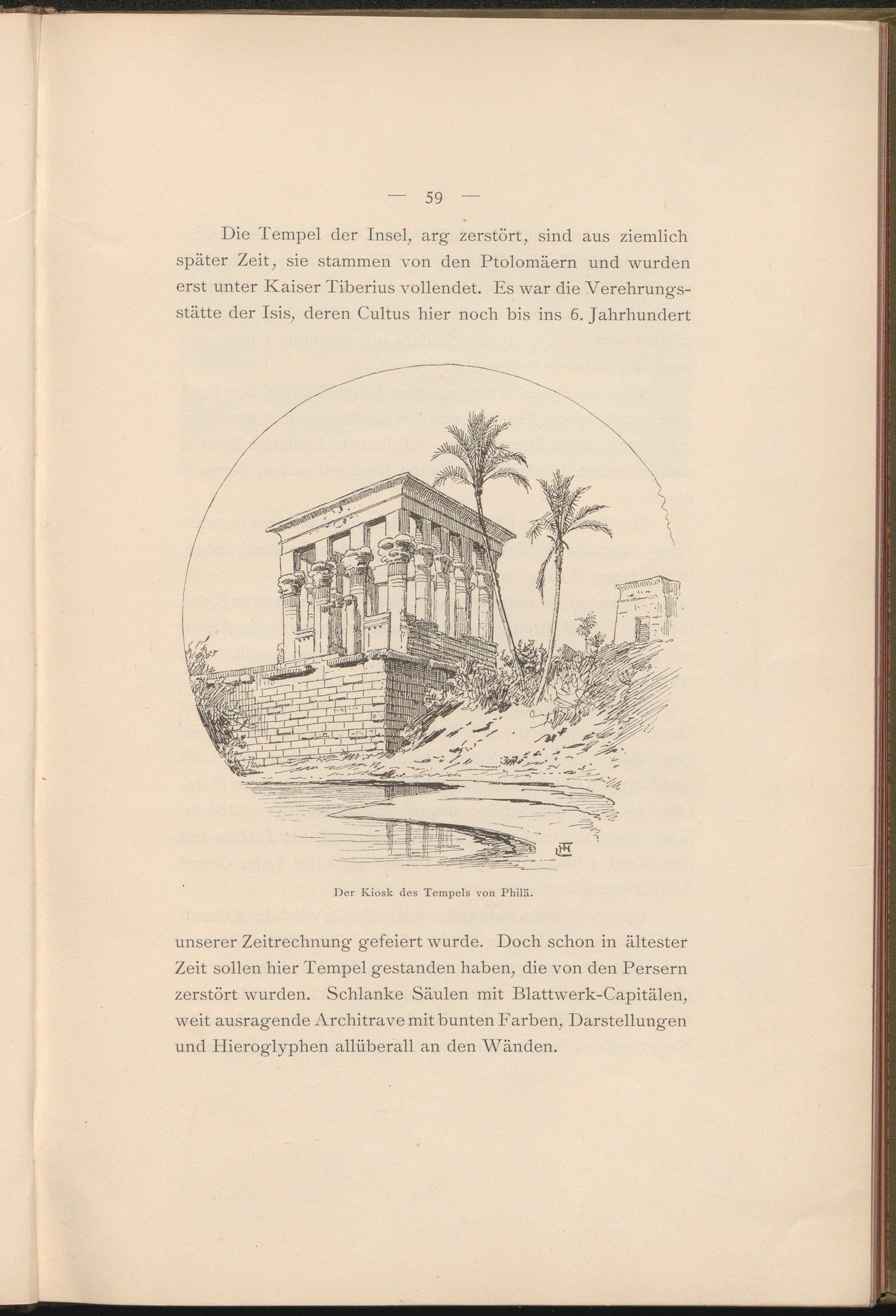 Die Tempel der Insel, arg zerstört, sind aus ziemlich später Zeit, sie stammen von den Ptolomäern und wurden erst unter Kaiser Tiberius vollendet. Es war die Verehrungsstätte der Isis, deren Cultus hier noch bis ins 6. Jahrhundert