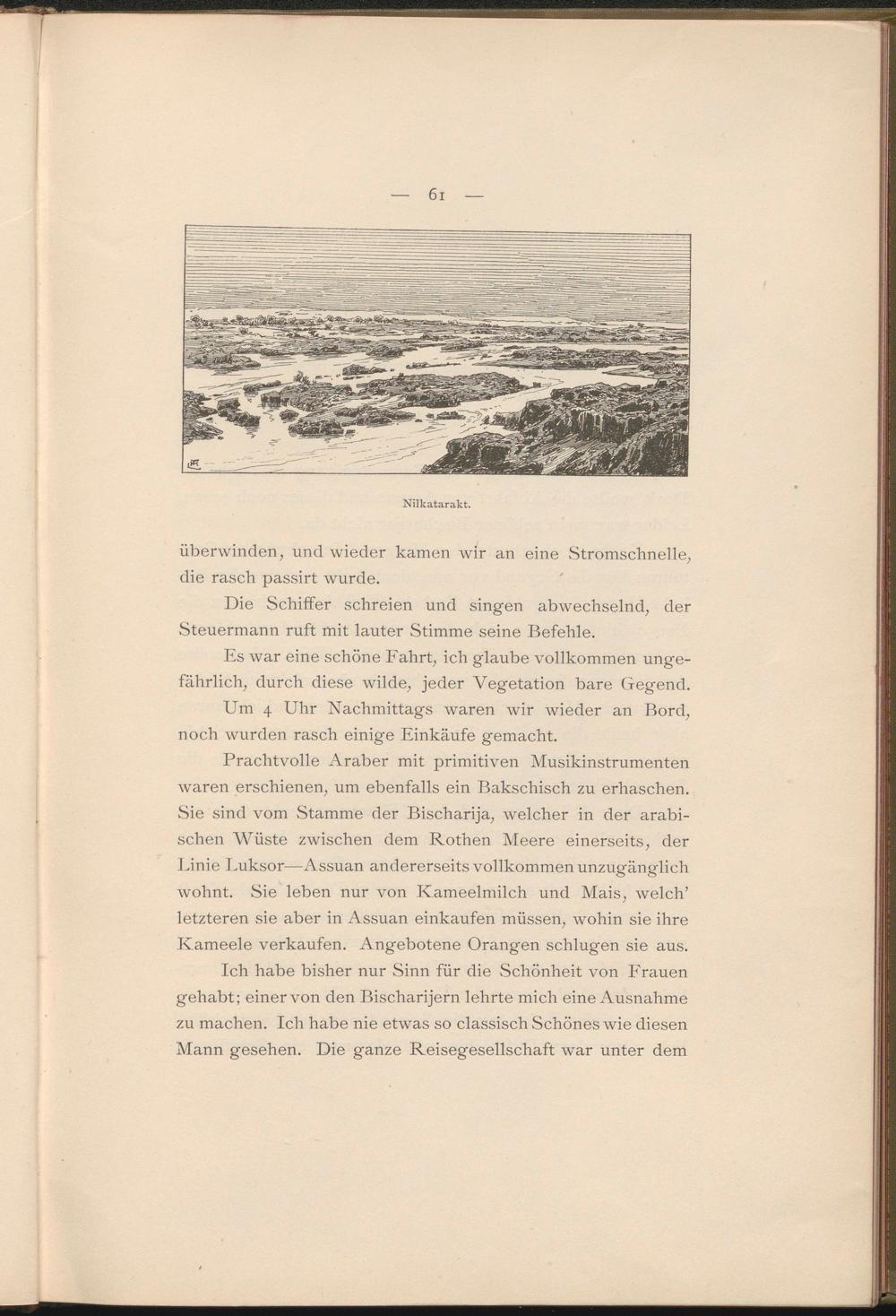 Prachtvolle Araber mit primitiven Musikinstrumenten waren erschienen, um ebenfalls ein Bakschisch zu erhaschen. Sie sind vom Stamme der Bischarija, welcher in der arabischen Wüste zwischen dem Rothen Meere einerseits, der Linie Luksor—Assuan andererseits vollkommen unzugänglich wohnt. Sie leben nur von Kameelmilch und Mais, welch’ letzteren sie aber in Assuan einkaufen müssen, wohin sie ihre Kameele verkaufen. Angebotene Orangen schlugen sie aus.