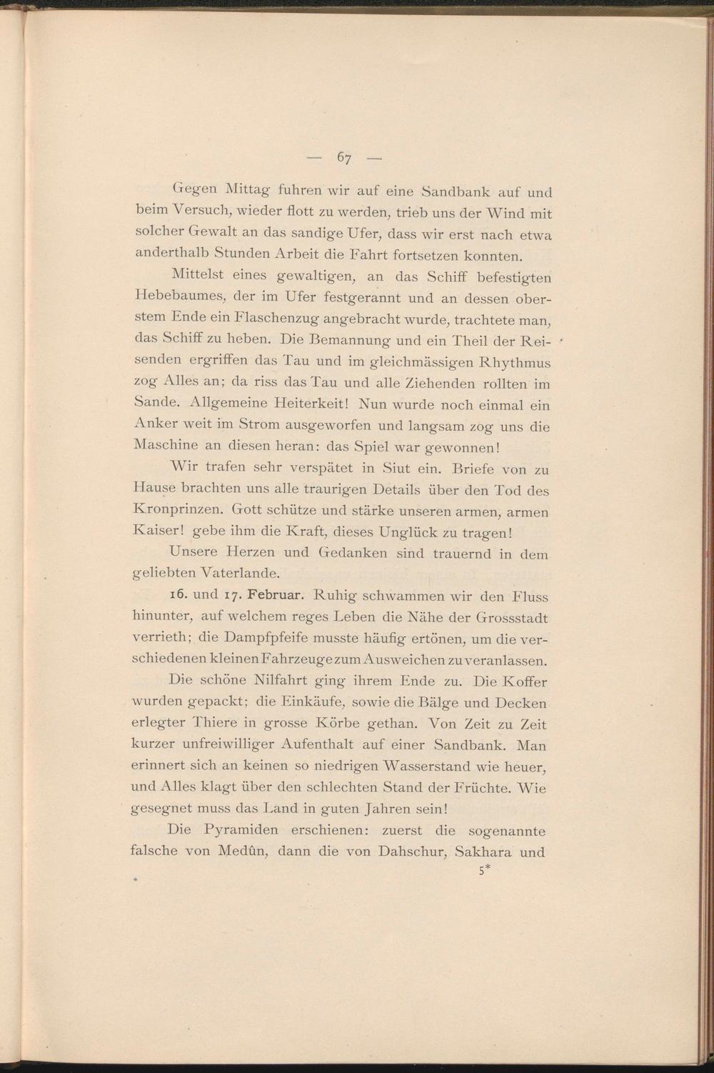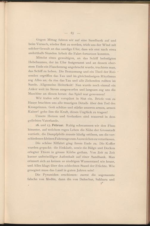 Wir trafen sehr verspätet in Siut ein. Briefe von zu Hause brachten uns alle traurigen Details über den Tod des Kronprinzen. Gott schütze und stärke unseren armen, armen Kaiser! gebe ihm die Kraft, dieses Unglück zu tragen!