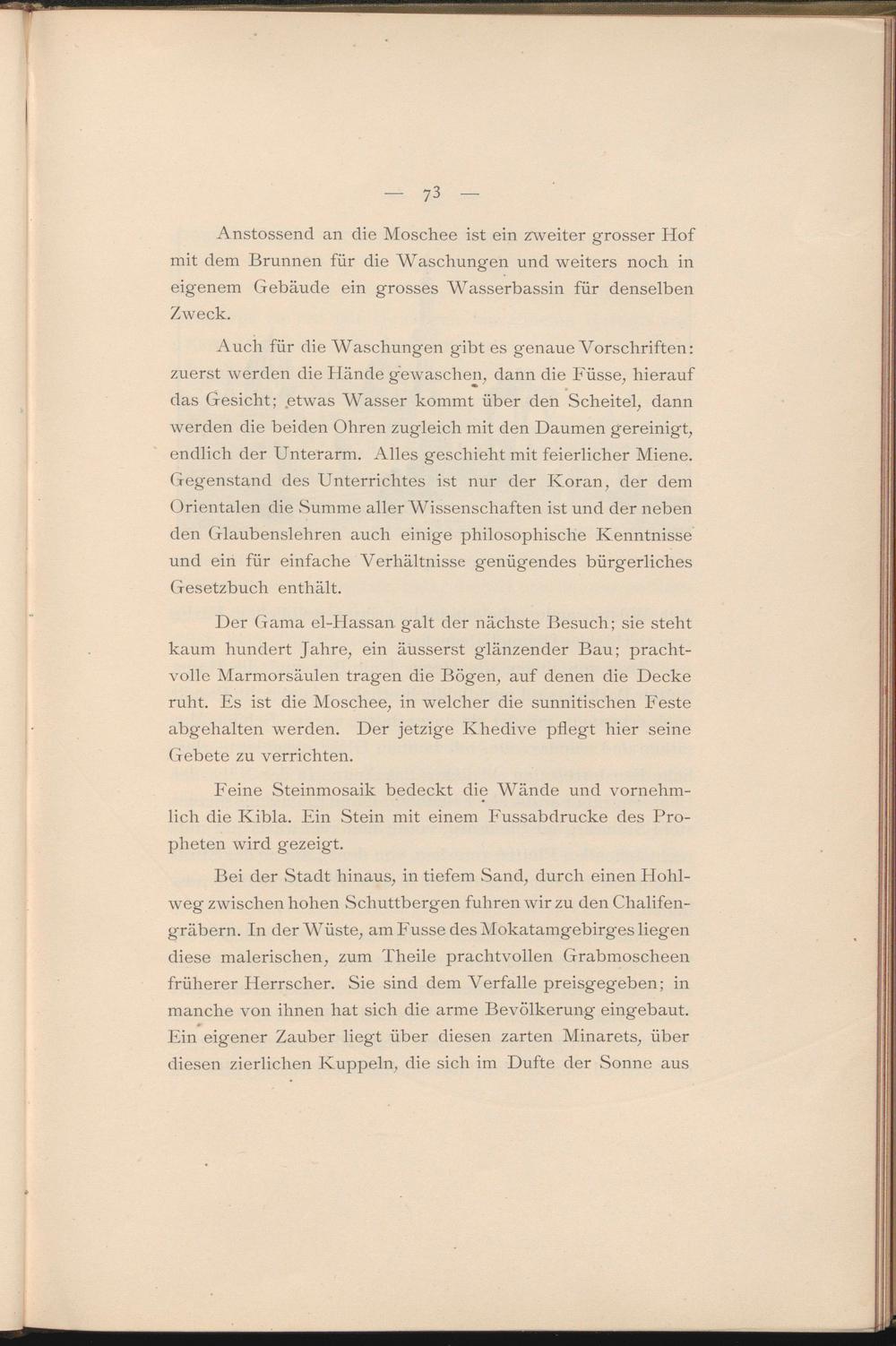 Auch für die Waschungen gibt es genaue Vorschriften: zuerst werden die Hände gewaschen, dann die Füsse, hierauf das Gesicht; .etwas Wasser kommt über den Scheitel, dann werden die beiden Ohren zugleich mit den Daumen gereinigt, endlich der Unterarm. Alles geschieht mit feierlicher Miene. Gegenstand des Unterrichtes ist nur der Koran, der dem Orientalen die .Summe aller Wissenschaften ist und der neben den Glaubenslehren auch einige philosophische Kenntnisse und ein für einfache Verhältnisse genügendes bürgerliches Gesetzbuch enthält.