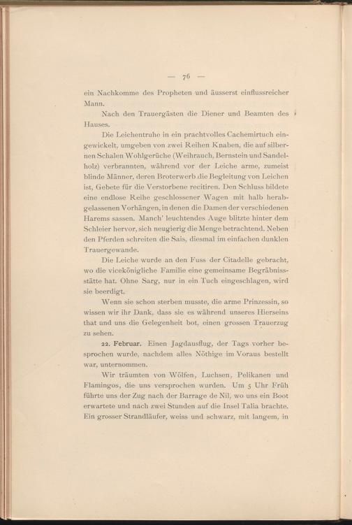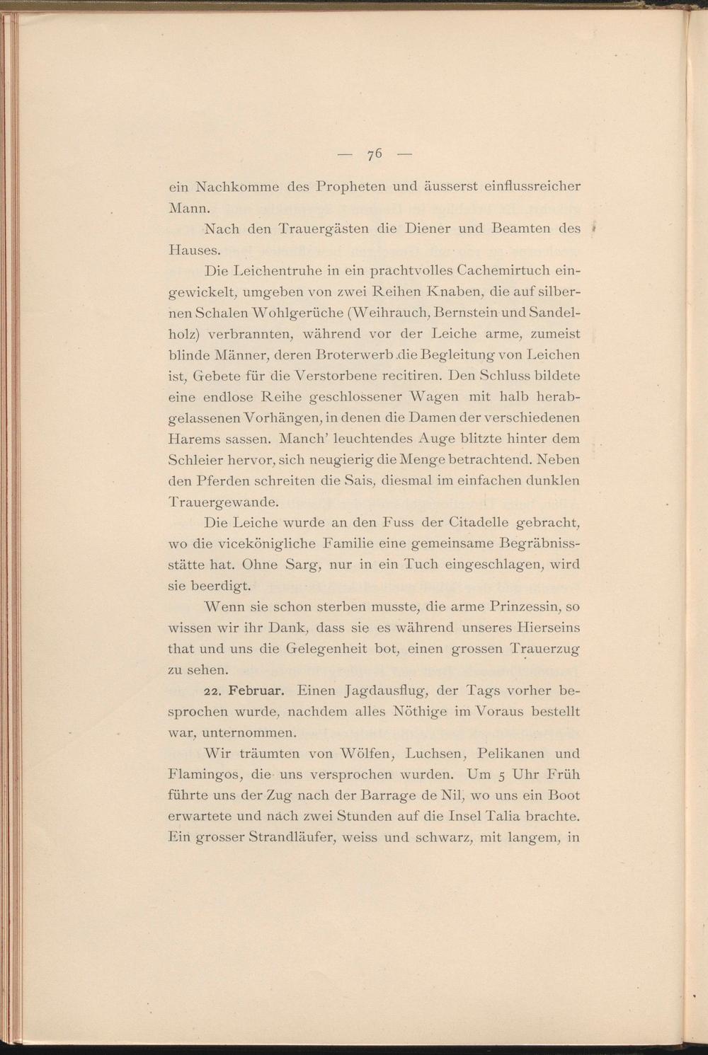 Die Leichentruhe in ein prachtvolles Cachemirtuch eingewickelt, umgeben von zwei Reihen Knaben, die auf silbernen Schalen Wohlgerüche (Weihrauch, Bernstein und Sandelholz) verbrannten, während vor der Leiche arme, zumeist blinde Männer, deren Broterwerb .die Begleitung von Leichen ist, Gebete für die Verstorbene recitiren. Den Schluss bildete eine endlose Reihe geschlossener Wagen mit halb herabgelassenen Vorhängen, in denen die Damen der verschiedenen Harems sassen. Manch’ leuchtendes Auge blitzte hinter dem Schleier hervor, sich neugierig die Menge betrachtend. Neben den Pferden schreiten die Sais, diesmal im einfachen dunklen Trauergewande.