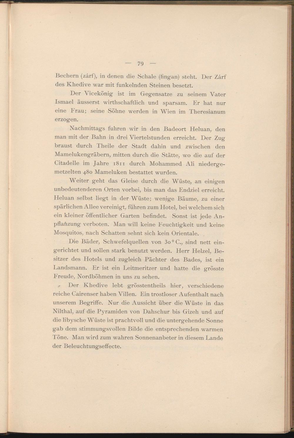 Nachmittags fuhren wir in den Badeort Heluan, den man mit der Bahn in drei Viertelstunden erreicht. Der Zug braust durch Theile der Stadt dahin und zwischen den Mamelukengräbern, mitten durch die Stätte, wo die auf der Citadelle im Jahre 1811 durch Mohammed Ali niedergemetzelten 480 Mameluken bestattet wurden.