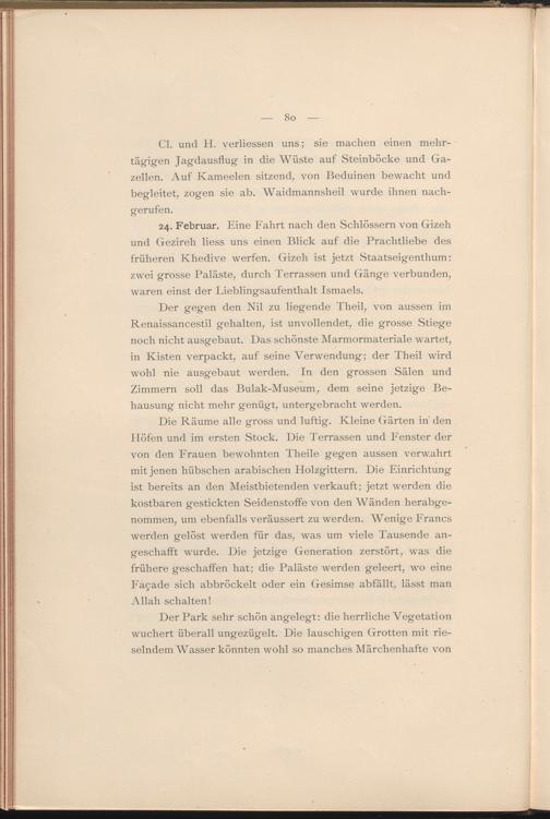 24. Februar. Eine Fahrt nach den Schlössern von Gizeh und Gezireh liess uns einen Blick auf die Prachtliebe des früheren Khedive werfen. Gizeh ist jetzt Staatseigenthum: zwei grosse Paläste, durch Terrassen und Gänge verbunden, waren einst der Lieblingsaufenthalt Ismaels.