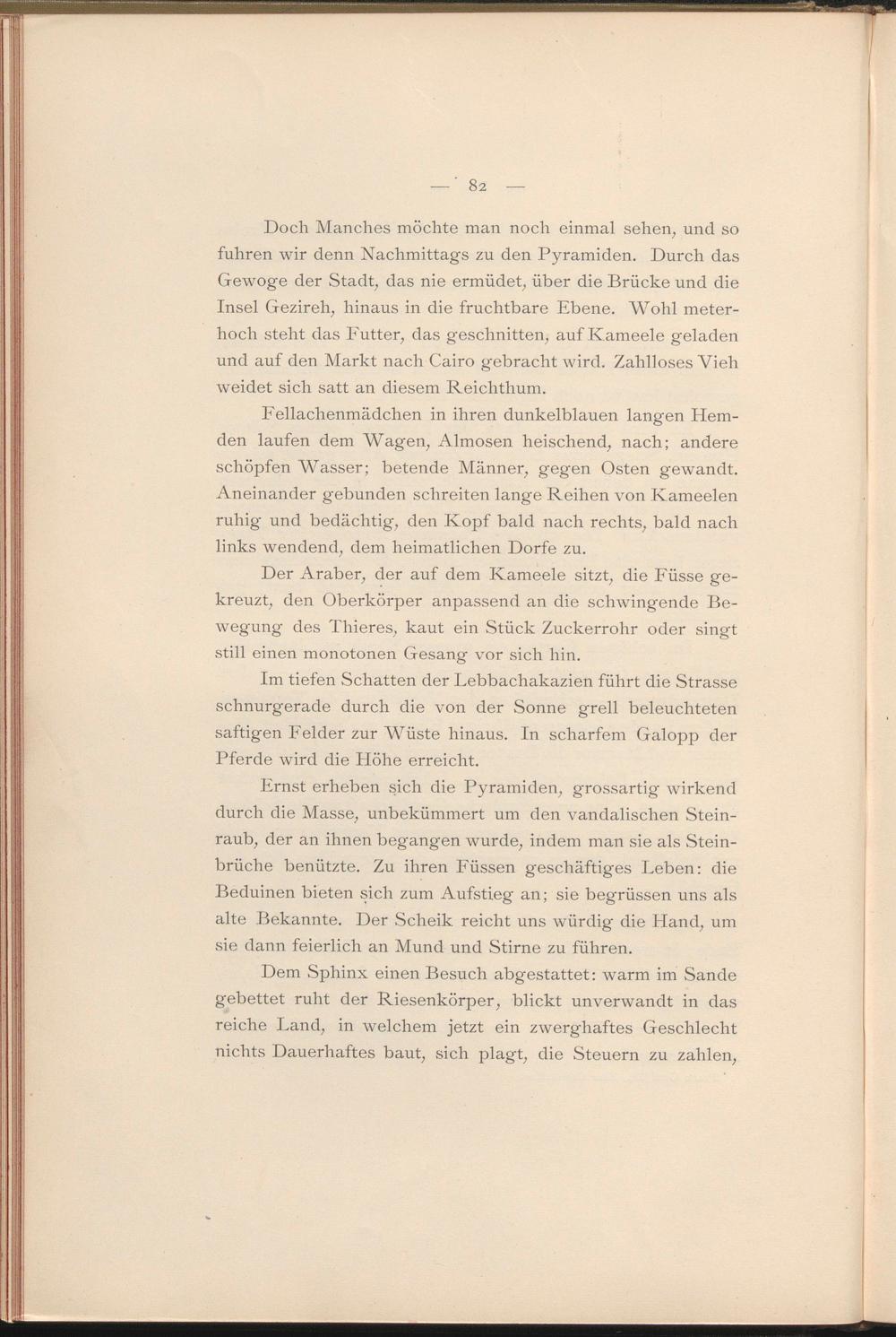 Ernst erheben sich die Pyramiden, grossartig wirkend durch die Masse, unbekümmert um den vandalischen Steinraub, der an ihnen begangen wurde, indem man sie als Steinbrüche benützte. Zu ihren Füssen geschäftiges Leben: die Beduinen bieten sich zum Aufstieg an; sie begrüssen uns als alte Bekannte. Der Scheik reicht uns würdig die Hand, um sie dann feierlich an Mund und Stirne zu führen.