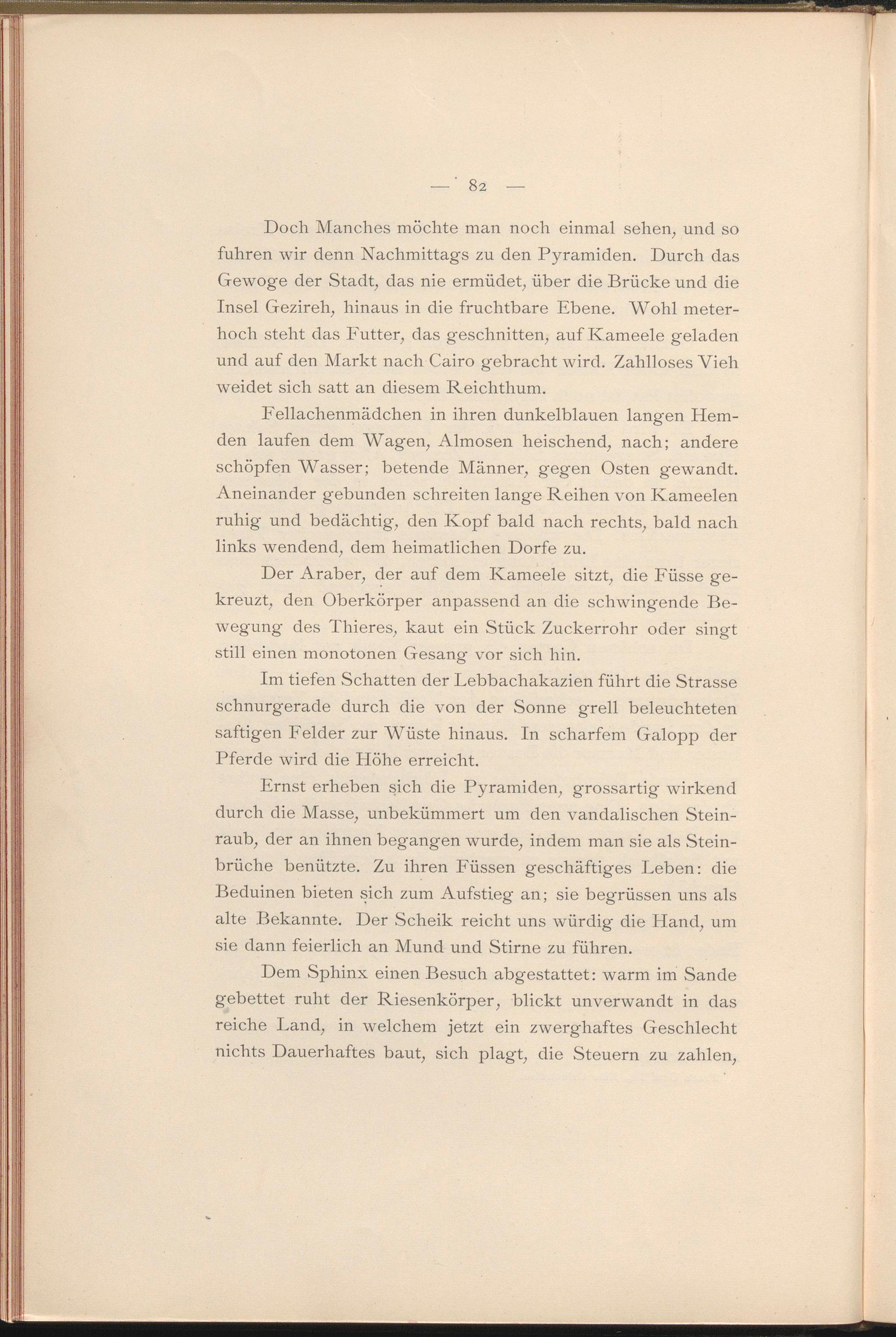 Fellachenmädchen in ihren dunkelblauen langen Hemden laufen dem Wagen, Almosen heischend, nach; andere schöpfen Wasser; betende Männer, gegen Osten gewandt. Aneinander gebunden schreiten lange Reihen von Kameelen ruhig und bedächtig, den Kopf bald nach rechts, bald nach links wendend, dem heimatlichen Dorfe zu.