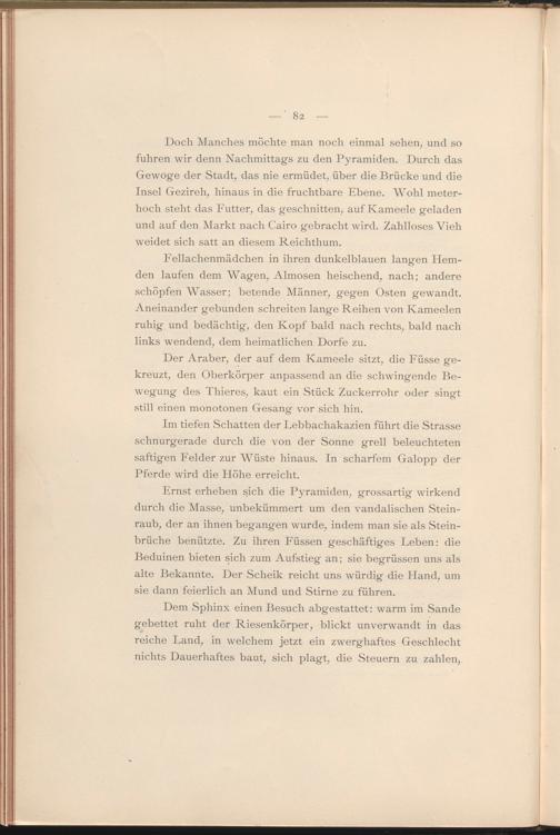 Dem Sphinx einen Besuch abgestattet: warm im Sande gebettet ruht der Riesenkörper, blickt unverwandt in das reiche Land, in welchem jetzt ein zwerghaftes Geschlecht nichts Dauerhaftes baut, sich plagt, die Steuern zu zahlen,
