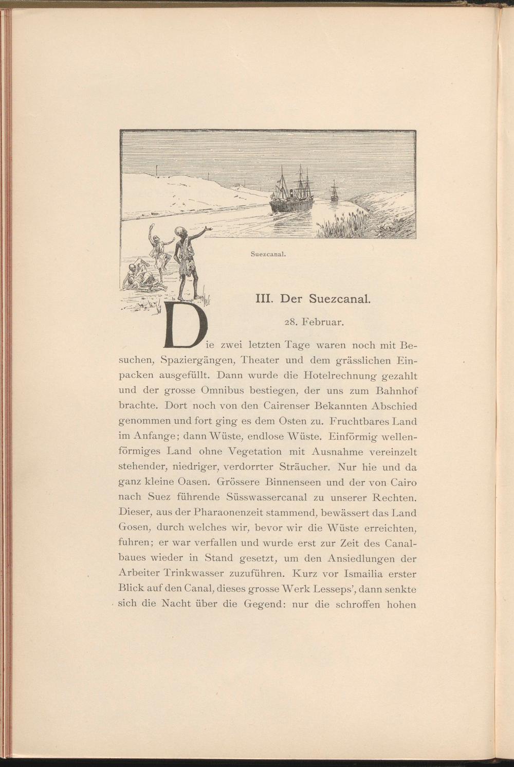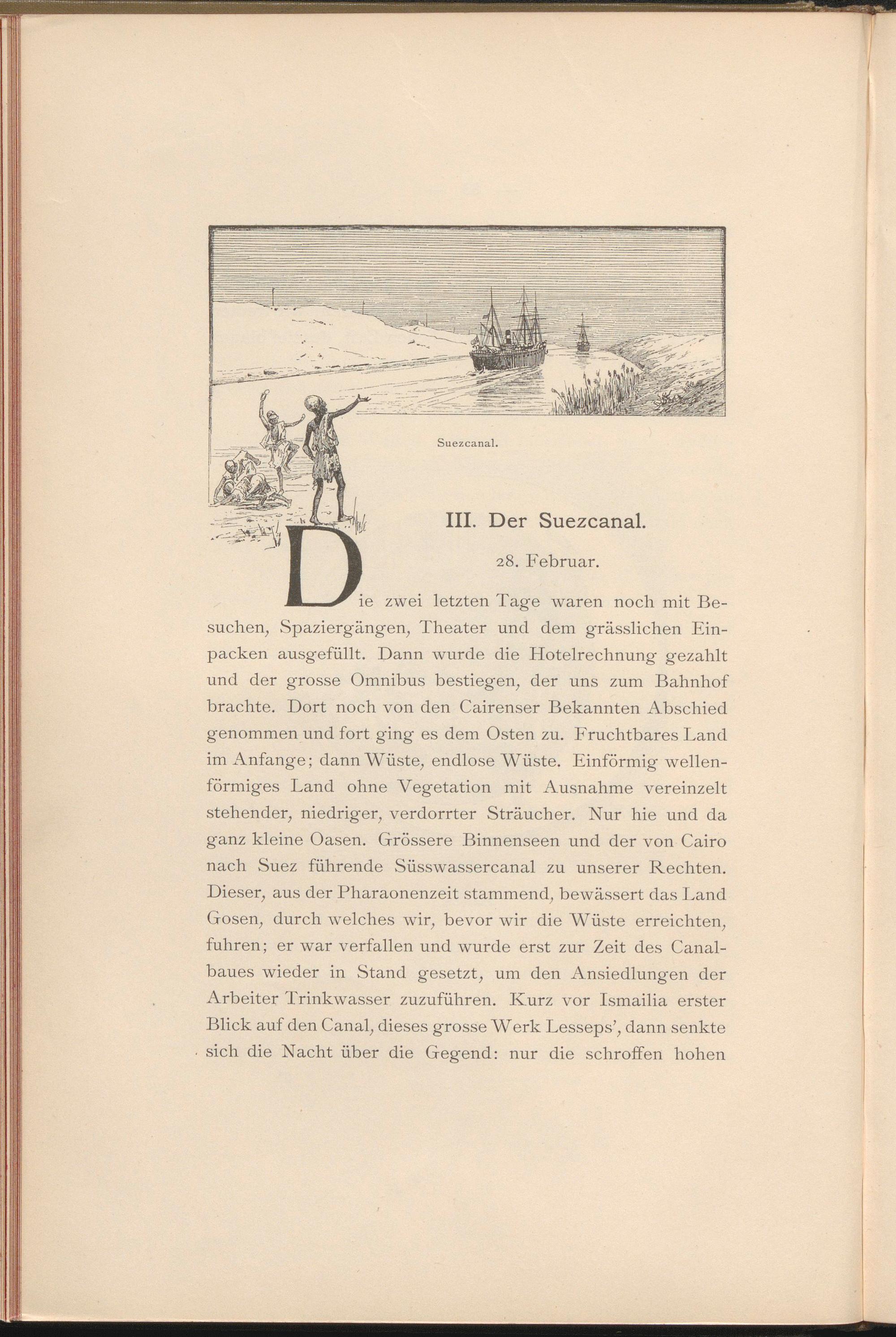 zwei letzten Tage waren noch mit Besuchen, Spaziergängen, Theater und dem grässlichen Einpacken ausgefüllt. Dann wurde die Hotelrechnung gezahlt und der grosse Omnibus bestiegen, der uns zum Bahnhof brachte. Dort noch von den Cairenser Bekannten Abschied genommen und fort ging es dem Osten zu. Fruchtbares Land im Anfänge; dann Wüste, endlose Wüste. Einförmig wellenförmiges Land ohne Vegetation mit Ausnahme vereinzelt stehender, niedriger, verdorrter Sträucher. Nur hie und da ganz kleine Oasen. Grössere Binnenseen und der von Cairo nach Suez führende Süsswassercanal zu unserer Rechten. Dieser, aus der Pharaonenzeit stammend, bewässert das Land Gosen, durch welches wir, bevor wir die Wüste erreichten, fuhren; er war verfallen und wurde erst zur Zeit des Canalbaues wieder in Stand gesetzt, um den Ansiedlungen der Arbeiter Trinkwasser zuzuführen. Kurz vor Ismailia erster Blick auf den Canal, dieses grosse Werk Lesseps’, dann senkte sich die Nacht über die Gegend: nur die schroffen hohen