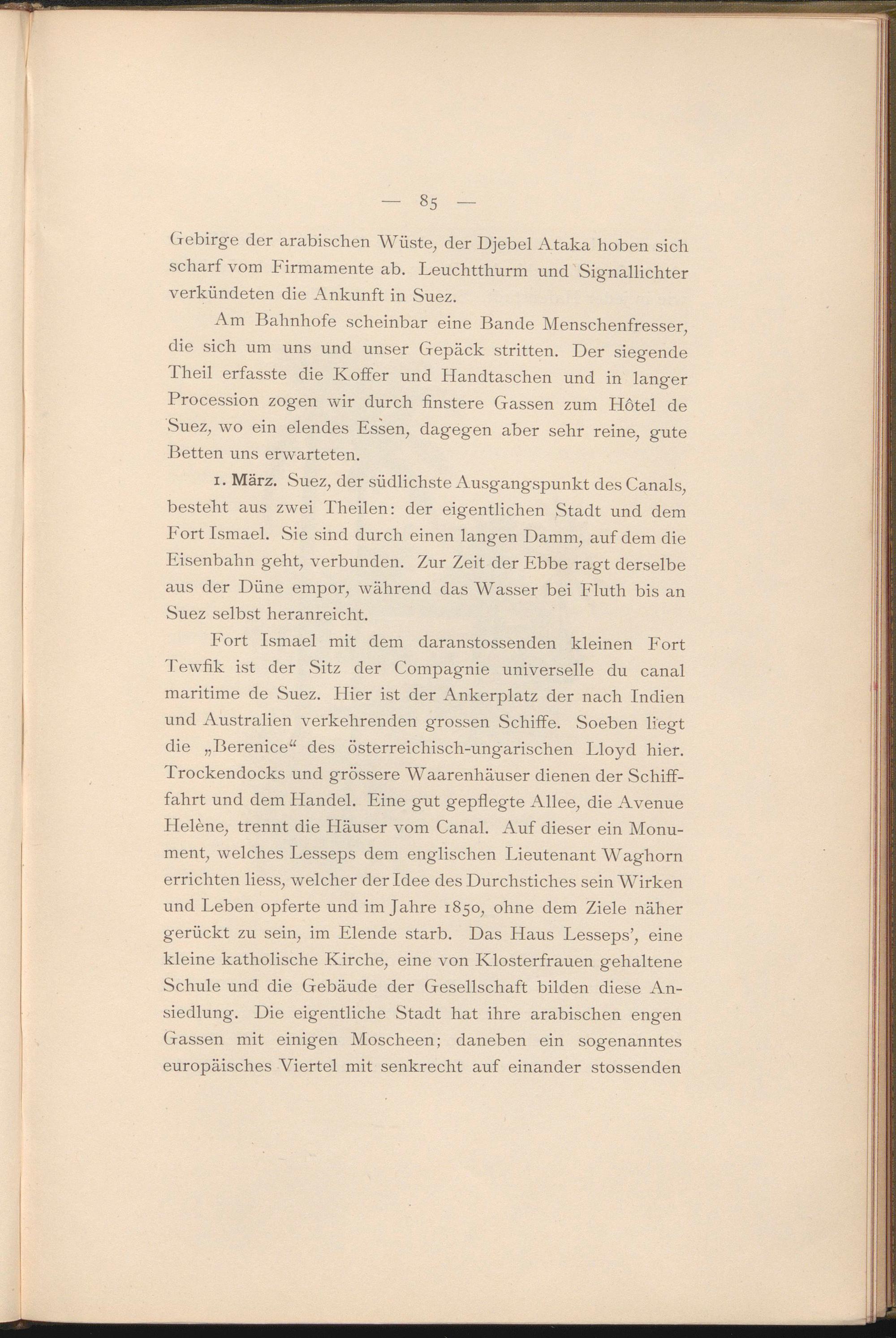 Fort Ismael mit dem daranstossenden kleinen Fort Tewfik ist der Sitz der Compagnie universelle du canal maritime de Suez. Hier ist der Ankerplatz der nach Indien und Australien verkehrenden grossen Schiffe. Soeben liegt die „Berenice“ des österreichisch-ungarischen Lloyd hier. Trockendocks und grössere Waarenhäuser dienen der Schifffahrt und dem Handel. Eine gut gepflegte Allee, die Avenue Helene, trennt die Häuser vom Canal. Auf dieser ein Monument, welches Lesseps dem englischen Lieutenant Waghorn errichten liess, welcher der Idee des Durchstiches sein Wirken und Leben opferte und im Jahre 1850, ohne dem Ziele näher gerückt zu sein, im Elende starb. Das Haus Lesseps’, eine kleine katholische Kirche, eine von Klosterfrauen gehaltene Schule und die Gebäude der Gesellschaft bilden diese Ansiedlung. Die eigentliche Stadt hat ihre arabischen engen Gassen mit einigen Moscheen; daneben ein sogenanntes europäisches Viertel mit senkrecht auf einander stossenden