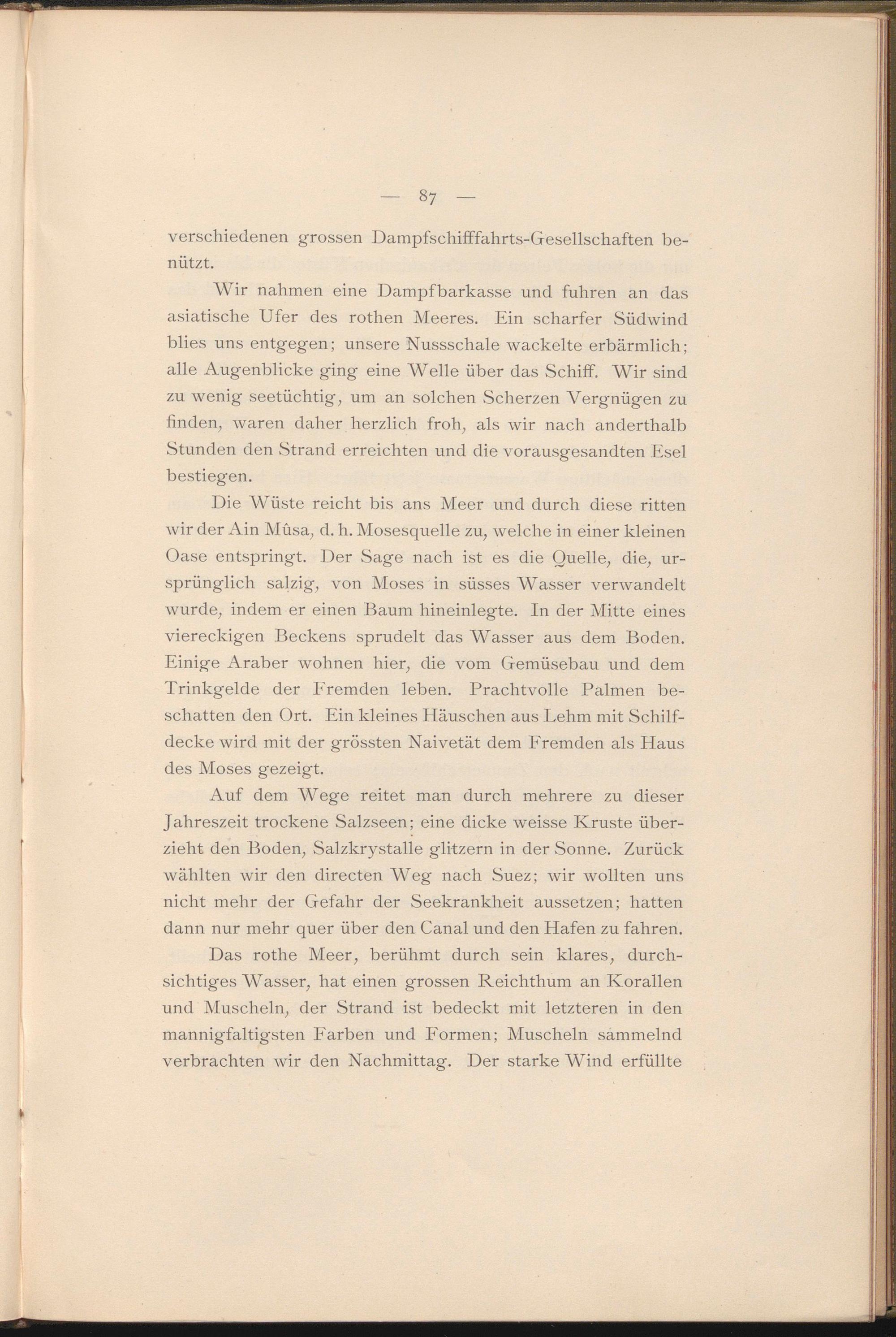 Die Wüste reicht bis ans Meer und durch diese ritten wir der Ain Müsa, d. h. Mosesquelle zu, welche in einer kleinen Oase entspringt. Der Sage nach ist es die Quelle, die, ursprünglich salzig, von Moses in süsses Wasser verwandelt wurde, indem er einen Baum hineinlegte. In der Mitte eines viereckigen Beckens sprudelt das Wasser aus dem Boden. Einige Araber wohnen hier, die vom Gemüsebau und dem Trinkgelde der Fremden leben. Prachtvolle Palmen beschatten den Ort. Ein kleines Häuschen aus Lehm mit Schilfdecke wird mit der grössten Naivetät dem Fremden als Haus des Moses gezeigt.