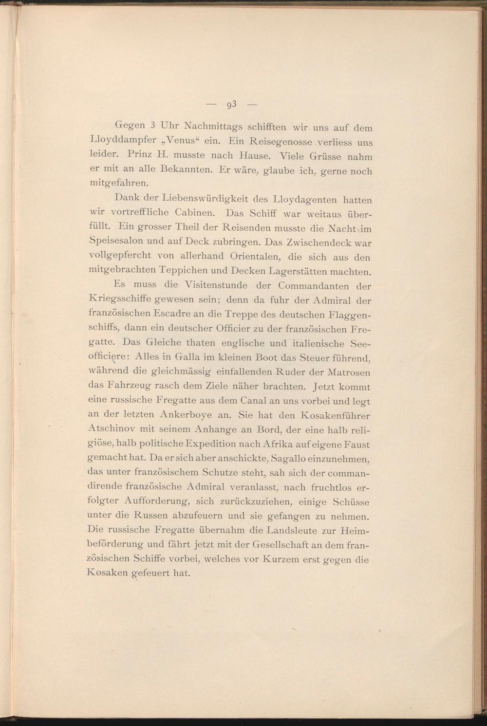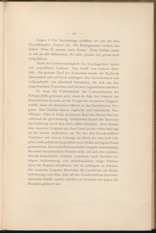 Gegen 3 Uhr Nachmittags schifften wir uns auf dem Lloyddampfer „Venus“ ein. Ein Reisegenosse verliess uns leider. Prinz H. musste nach Hause. Viele Grüsse nahm er mit an alle Bekannten. Er wäre, glaube ich, gerne noch mitgefahren.