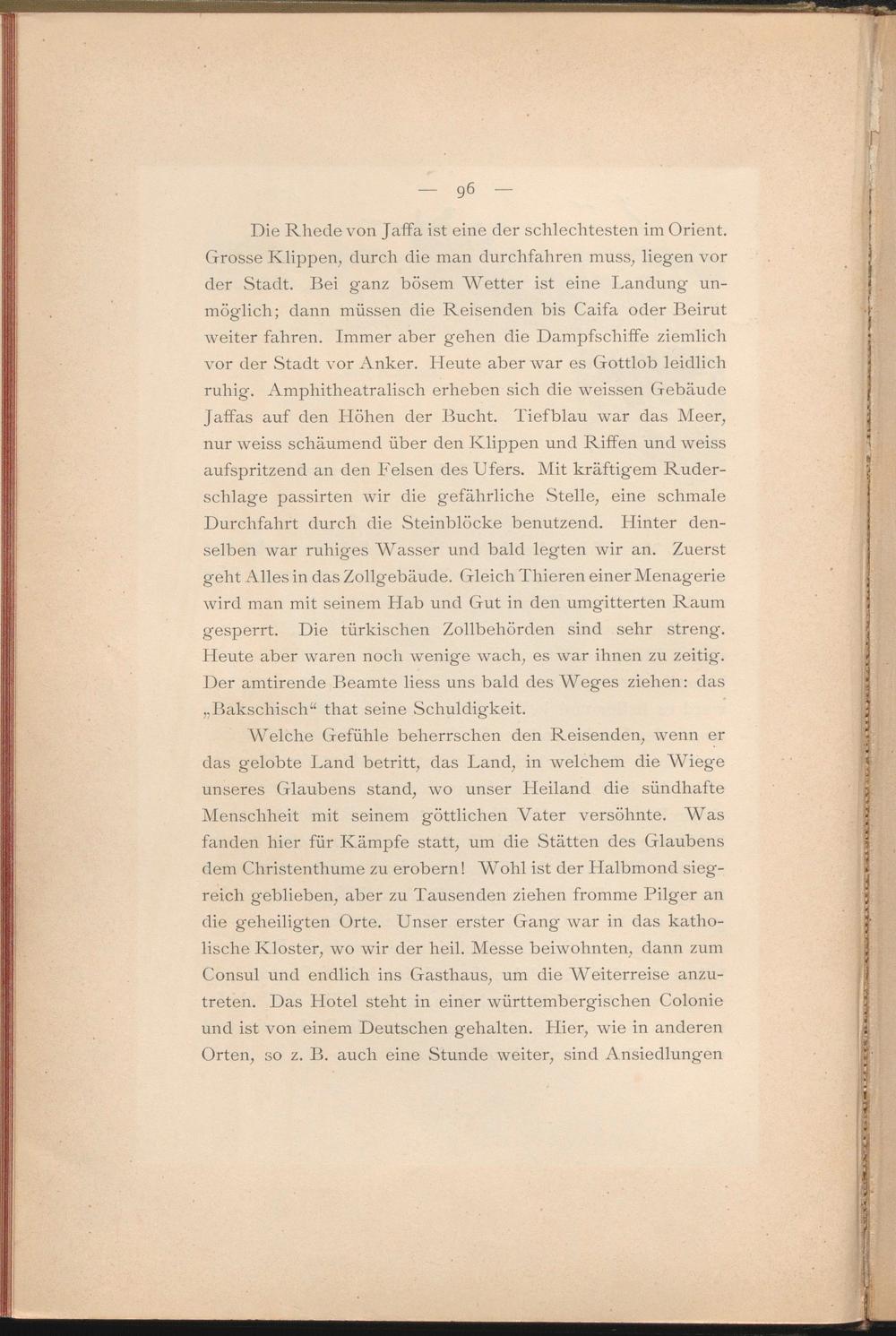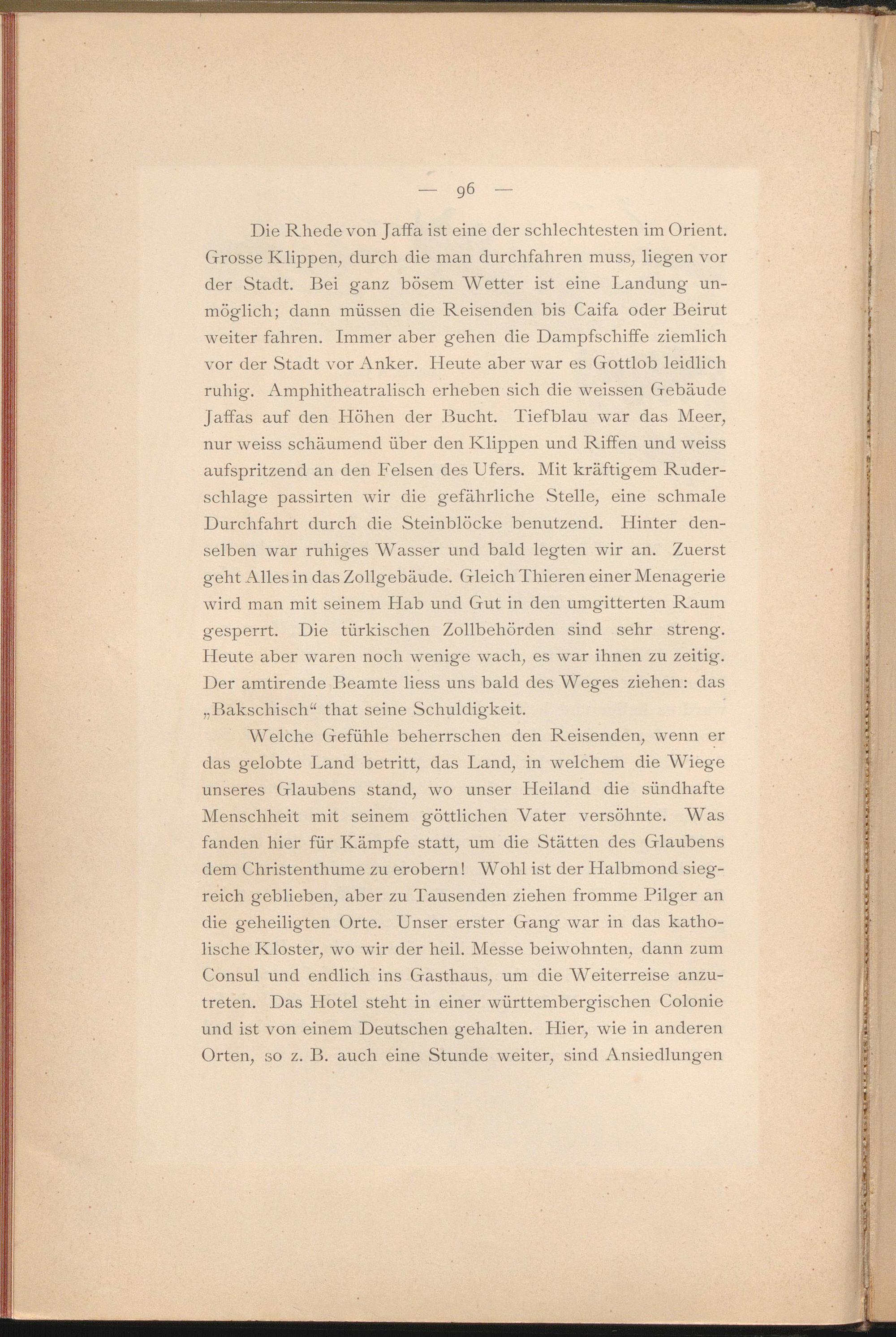 Welche Gefühle beherrschen den Reisenden, wenn er das gelobte Land betritt, das Land, in welchem die Wiege unseres Glaubens stand, wo unser Heiland die sündhafte Menschheit mit seinem göttlichen Vater versöhnte. Was fanden hier für Kämpfe statt, um die Stätten des Glaubens dem Christenthume zu erobern! Wohl ist der Halbmond siegreich geblieben, aber zu Tausenden ziehen fromme Pilger an die geheiligten Orte. Unser erster Gang war in das katholische Kloster, wo wir der heil. Messe beiwohnten, dann zum Consul und endlich ins Gasthaus, um die Weiterreise anzutreten. Das Hotel steht in einer württembergischen Colonie und ist von einem Deutschen gehalten. Hier, wie in anderen Orten, so z. B. auch eine Stunde weiter, sind Ansiedlungen