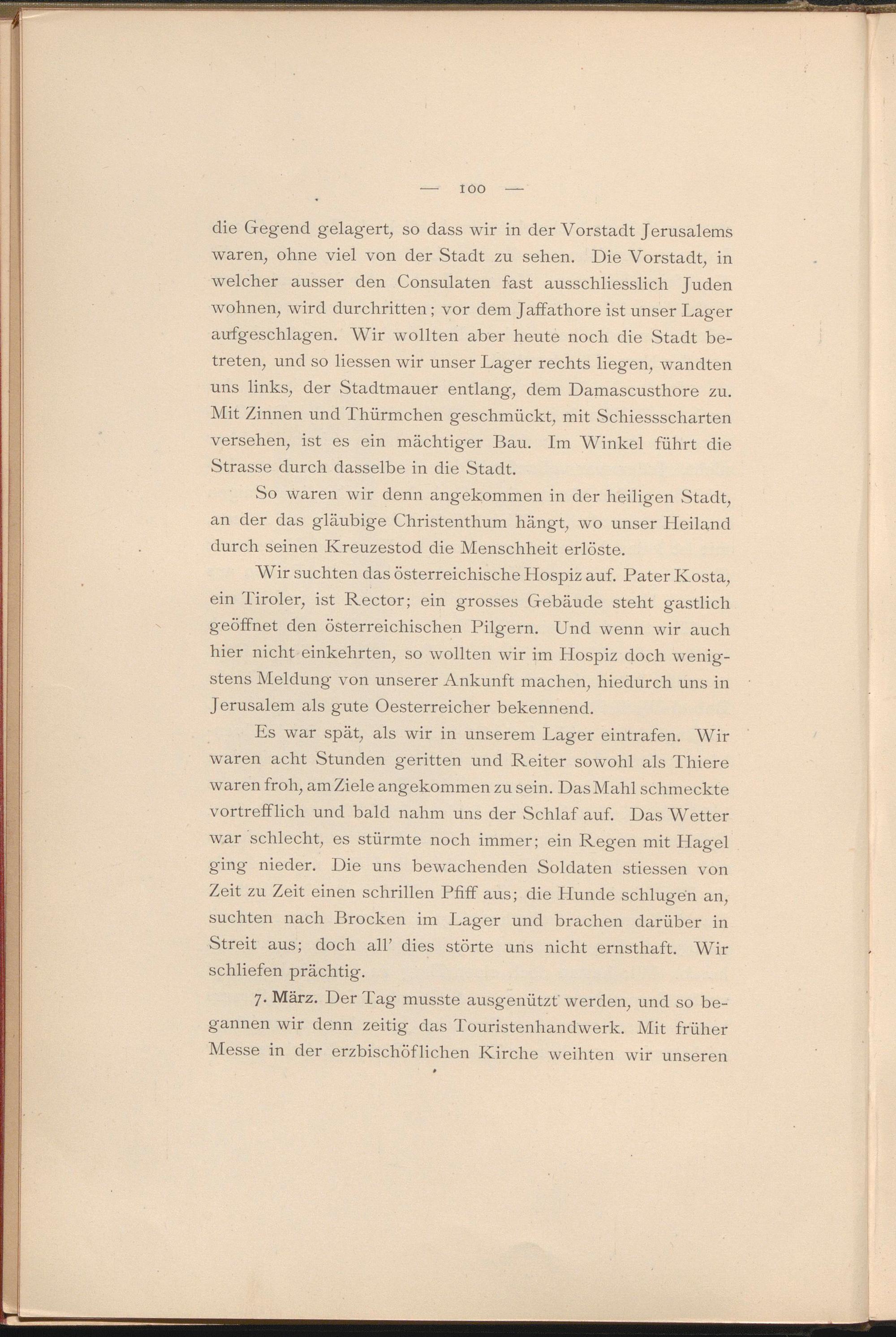 Wir suchten das österreichische Hospiz auf. Pater Kosta, ein Tiroler, ist Rector; ein grosses Gebäude steht gastlich geöffnet den österreichischen Pilgern. Und wenn wir auch hier nicht einkehrten, so wollten wir im Hospiz doch wenigstens Meldung von unserer Ankunft machen, hiedurch uns in Jerusalem als gute Oesterreicher bekennend.