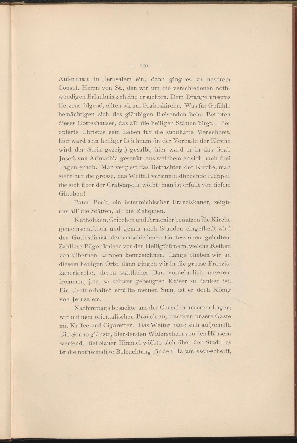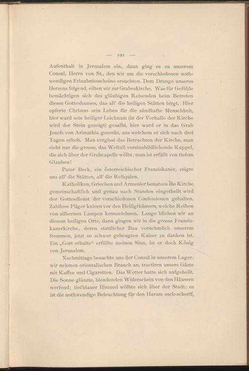 Aufenthalt in Jerusalem ein, dann ging es zu unserem Consul, Herrn von St., den wir um die verschiedenen noth- wendigen Erlaubnissscheine ersuchten. Dem Drange unseres 1 Terzens folgend, eilten wir zur Grabeskirche. Was für Gefühle bemächtigen sich des gläubigen Reisenden beim Betreten dieses Gotteshauses, das all’ die heiligen Stätten birgt. Hier opferte Christus sein Leben für die sündhafte Menschheit, hier ward sein heiliger Leichnam (in der Vorhalle der Kirche wird der Stein gezeigt) gesalbt, hier ward er in das Grab Josefs von Arimathia gesenkt, aus welchem er sich nach drei Tagen erhob. Man vergisst das Betrachten der Kirche, man sieht nur die grosse, das Weltall versinnbildlichende Kuppel, die sich über der Grabcapelle wölbt; man ist erfüllt von tiefem Glauben!