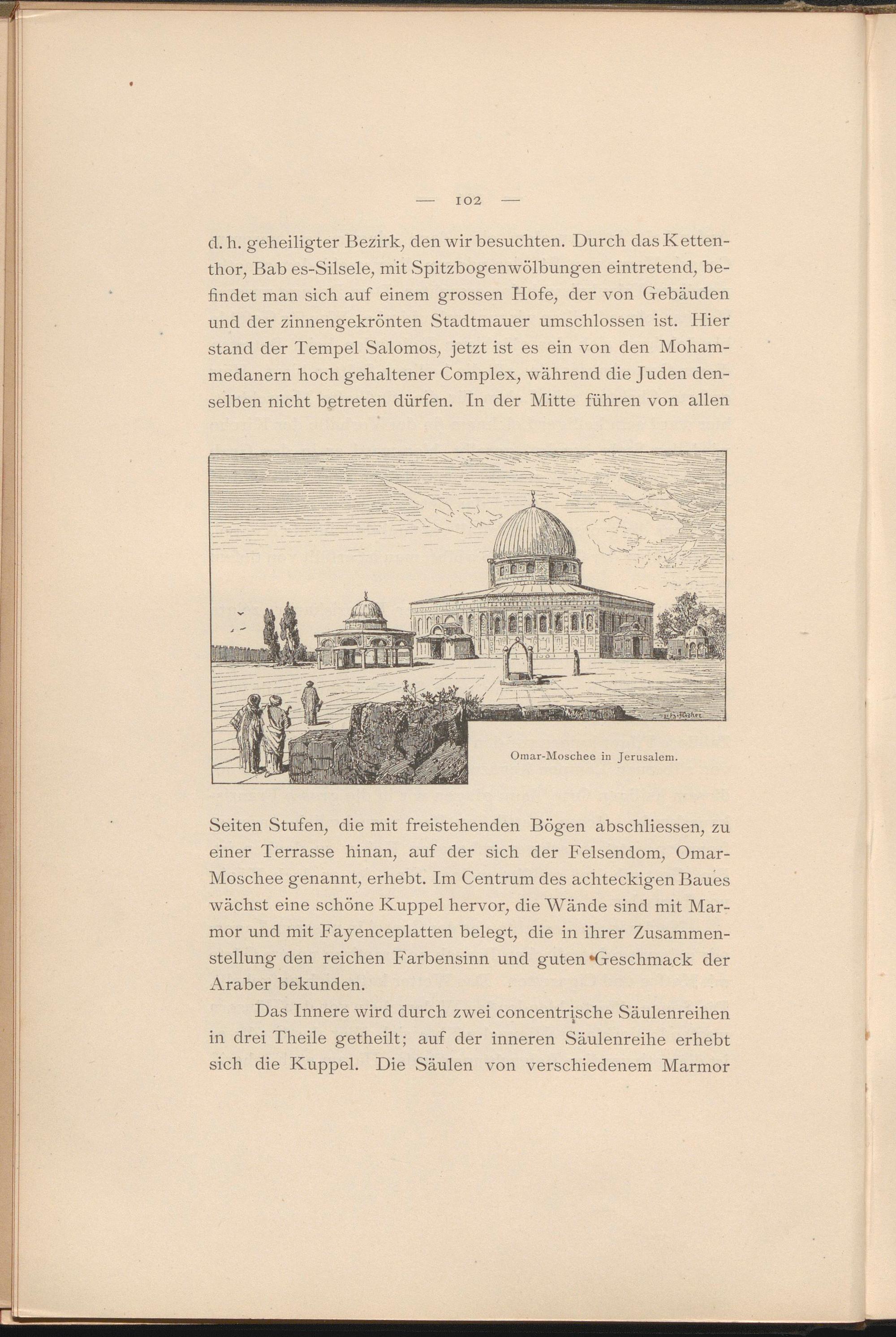 Seiten Stufen ; die mit freistehenden Bögen abschliessen ; zu einer Terrasse hinan, auf der sich der Felsendom, Omar- Moschee genannt, erhebt. Im Centrum des achteckigen Baues wächst eine schöne Kuppel hervor, die Wände sind mit Marmor und mit Fayenceplatten belegt, die in ihrer Zusammenstellung den reichen Farbensinn und guten »Geschmack der Araber bekunden.