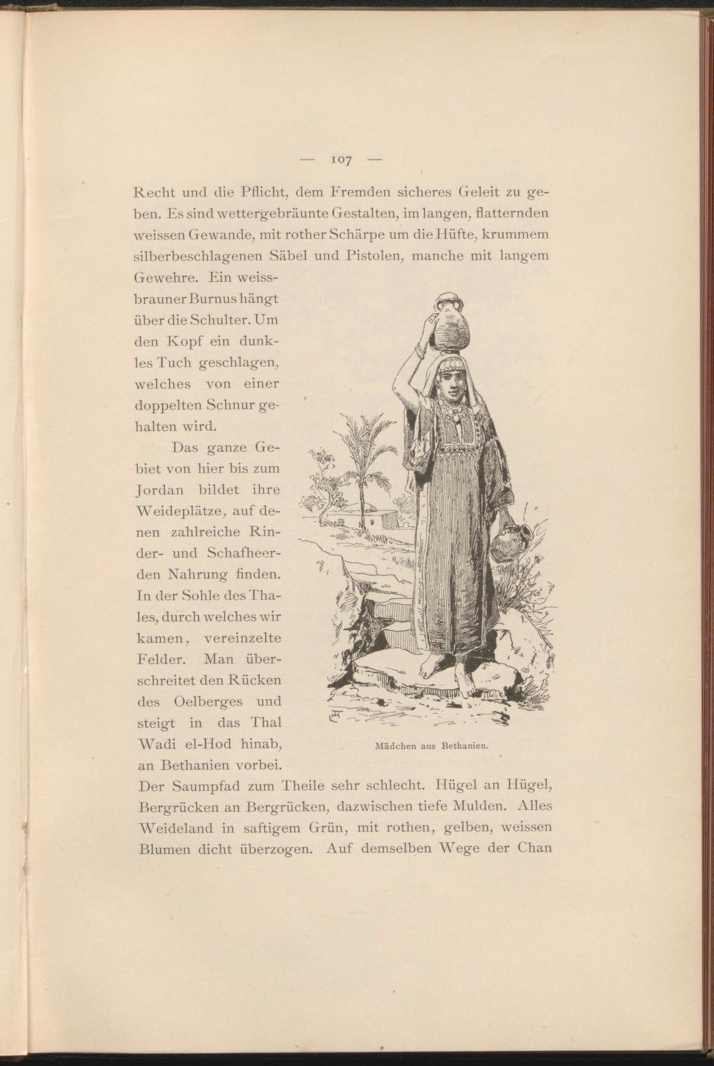 Recht und die Pflicht, dem Fremden sicheres Geleit zu geben. Es sind wettergebräunte Gestalten, im langen, flatternden weissen Gewände, mit rother Schärpe um die Hüfte, krummem silberbeschlagenen Säbel und Pistolen, manche mit langem Gewehre. Ein weissbrauner Burnus hängt über die Schulter. Um den Kopf ein dunkles Tuch geschlagen, welches von einer doppelten Schnur gehalten wird.