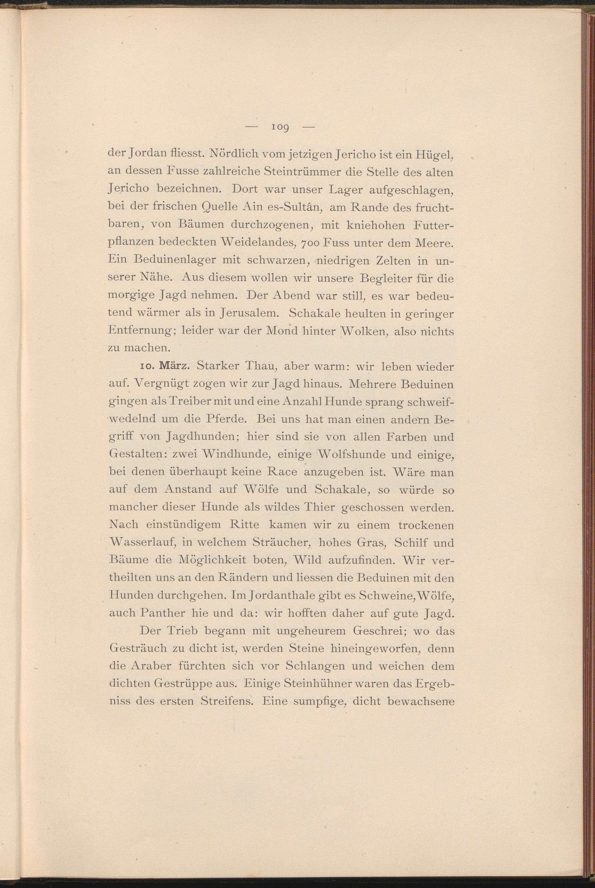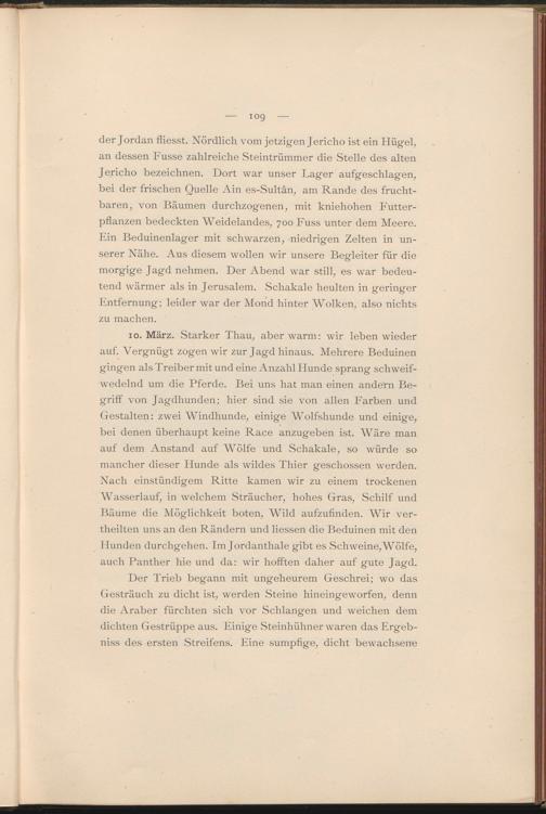 10. März. Starker Thau, aber warm: wir leben wieder auf. Vergnügt zogen wir zur Jagd hinaus. Mehrere Beduinen gingen als Treiber mit und eine Anzahl Hunde sprang schweifwedelnd um die Pferde. Bei uns hat man einen andern Begriff von Jagdhunden; hier sind sie von allen Farben und Gestalten: zwei Windhunde, einige Wolfshunde und einige, bei denen überhaupt keine Race anzugeben ist. Wäre man auf dem Anstand auf Wölfe und Schakale, so würde so mancher dieser Hunde als wildes Thier geschossen werden. Nach einstündigem Ritte kamen wir zu einem trockenen Wasserlauf, in welchem Sträucher, hohes Gras, Schilf und Bäume die Möglichkeit boten, Wild aufzufinden. Wir vertheilten uns an den Rändern und Hessen die Beduinen mit den 1 Tunden durchgehen. Im Jordanthale gibt es Schweine,Wölfe, auch Panther hie und da: wir hofften daher auf gute Jagd.