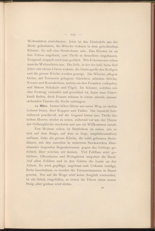Von Weitem schon ist Bethlehem zu sehen, wie es sich auf dem Berge, auf dem es liegt, amphitheatralisch auf baut; links die grosse Kirche, die solid gebauten Steinhäuser, mit den zuweilen in mehreren Stockwerken übereinander liegenden Bogenterrassen gegen das Gebirge gerichtet, über welches wir kämen. Viel Feldbau wird getrieben; Olivenhaine und Weingärten umgeben die Stadt. Auf allen Feldern und in den Gärten die Leute an der Arbeit. Es wird gepflügt, angebaut und Unkraut vertilgt, Rebe beschnitten; es werden die Terrassenmauern in Stand gesetzt. Nur auf die Wege wird keine Sorgfalt verwendet; ist ein Stück eingefallen, so treten die Thiere einen neuen Steig, aber gethan ward nichts.