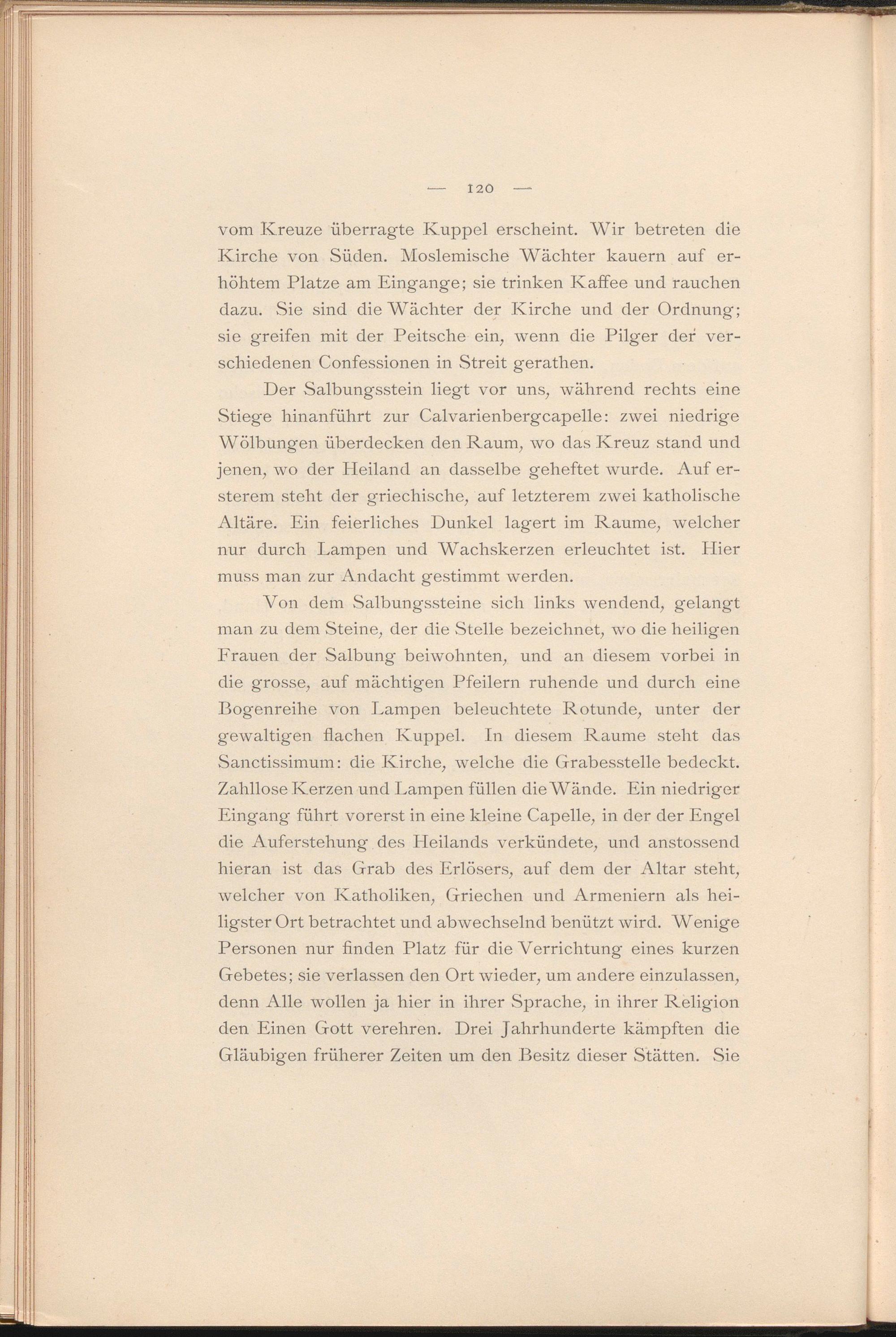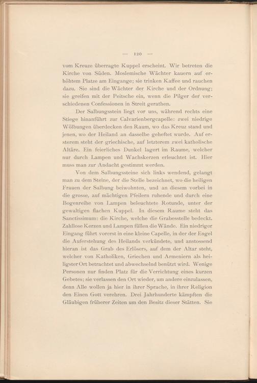 Von dem Salbungssteine sich links wendend, gelangt man zu dem Steine, der die Stelle bezeichnet, wo die heiligen Frauen der Salbung beiwohnten, und an diesem vorbei in die grosse, auf mächtigen Pfeilern ruhende und durch eine Bogenreihe von Lampen beleuchtete Rotunde, unter der gewaltigen flachen Kuppel. In diesem Raume steht das Sanctissimum: die Kirche, welche die Grabesstelle bedeckt. Zahllose Kerzen und Lampen füllen die Wände. Ein niedriger Eingang führt vorerst in eine kleine Capelle, in der der Engel die Auferstehung des Heilands verkündete, und anstossend hieran ist das Grab des Erlösers, auf dem der Altar steht, welcher von Katholiken, Griechen und Armeniern als heiligster Ort betrachtet und abwechselnd benützt wird. Wenige Personen nur finden Platz für die Verrichtung eines kurzen Gebetes; sie verlassen den Ort wieder, um andere einzulassen, denn Alle wollen ja hier in ihrer Sprache, in ihrer Religion den Einen Gott verehren. Drei Jahrhunderte kämpften die Gläubigen früherer Zeiten um den Besitz dieser Stätten. Sie