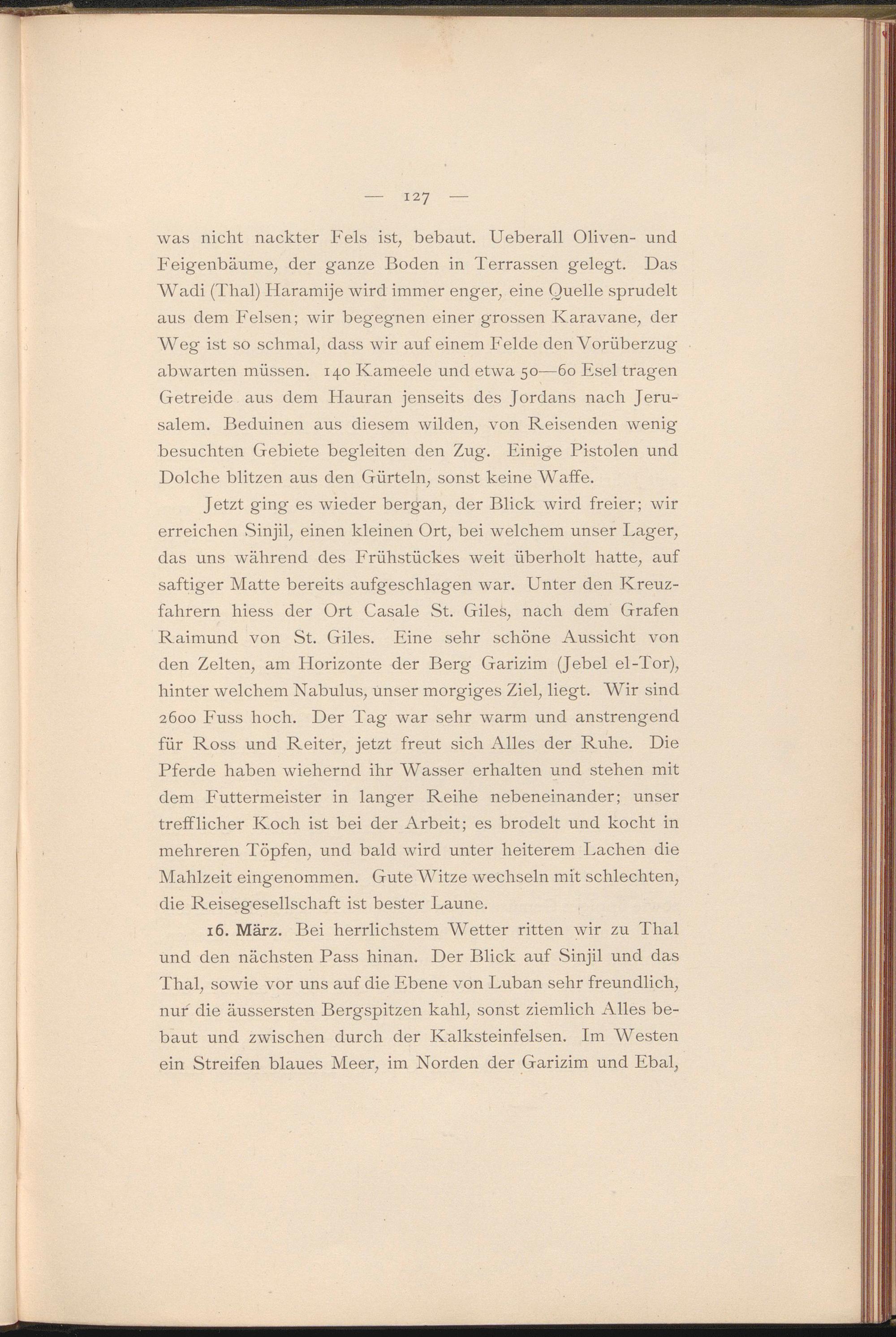 16. März. Bei herrlichstem Wetter ritten wir zu Thal und den nächsten Pass hinan. Der Blick auf Sinjil und das Thal, sowie vor uns auf die Ebene von Luban sehr freundlich, nur die äussersten Bergspitzen kahl, sonst ziemlich Alles bebaut und zwischen durch der Kalksteinfelsen. Im AA^esten ein Streifen blaues Meer, im Norden der Garizim und Ebal,