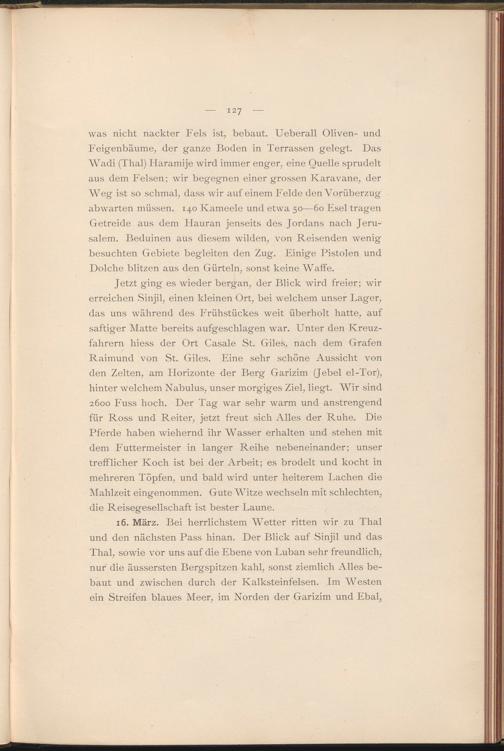 Jetzt ging es wieder bergan, der Blick wird freier; wir erreichen Sinjil, einen kleinen Ort, bei welchem unser Lager, das uns während des Frühstückes weit überholt hatte, auf saftiger Matte bereits aufgeschlagen war. Unter den Kreuzfahrern hiess der Ort Casale St. Giles, nach dem Grafen Raimund von St. Giles. Eine sehr schöne Aussicht von den Zelten, am Horizonte der Berg Garizim (Jebel el-Tor), hinter welchem Nabulus, unser morgiges Ziel, liegt. Wir sind 2600 Fuss hoch. Der Tag war sehr warm und anstrengend für Ross und Reiter, jetzt freut sich Alles der Ruhe. Die Pferde haben wiehernd ihr Wasser erhalten und stehen mit dem Futtermeister in langer Reihe nebeneinander; unser trefflicher Koch ist bei der Arbeit; es brodelt und kocht in mehreren Töpfen, und bald wird unter heiterem Lachen die Mahlzeit eingenommen. Gute Witze wechseln mit schlechten, die Reisegesellschaft ist bester Laune.