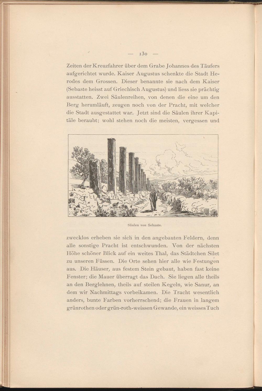 Zeiten der Kreuzfahrer über dem Grabe Johannes des Täufers aufgerichtet wurde. Kaiser Augustus schenkte die Stadt He- rodes dem Grossen. Dieser benannte sie nach dem Kaiser (Sebaste heisst auf Griechisch Augustus) und liess sie prächtig ausstatten. Zwei Säulenreihen, von denen die eine um den Berg herumläuft, zeugen noch von der Pracht, mit welcher die Stadt ausgestattet war. Jetzt sind die Säulen ihrer Kapi- täle beraubt; wohl stehen noch die meisten, vergessen und