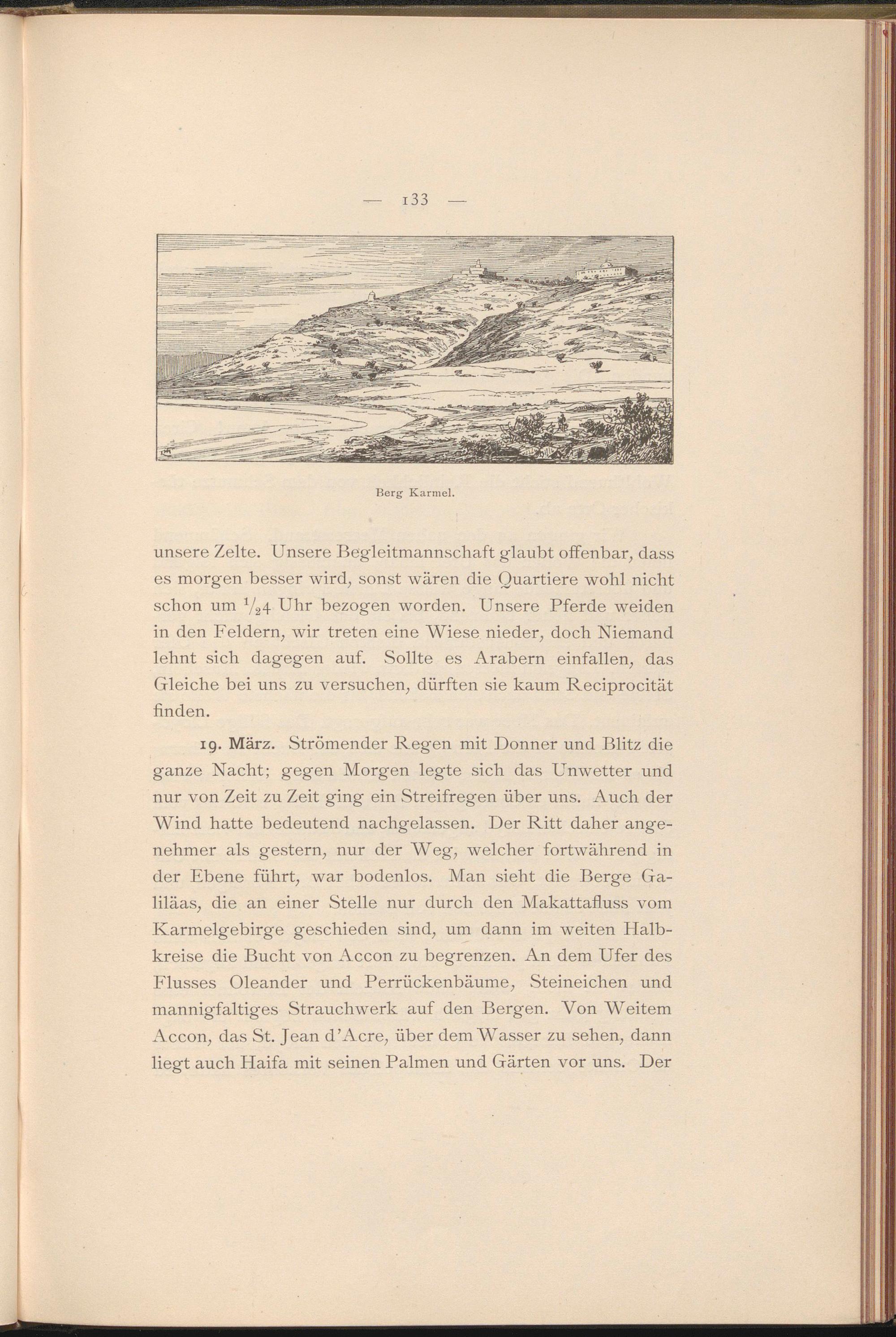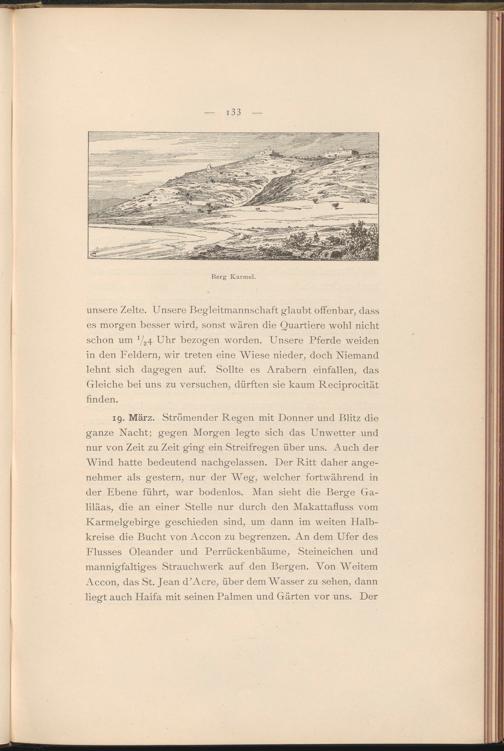 19. März. Strömender Regen mit Donner und Blitz die ganze Nacht; gegen Morgen legte sich das Unwetter und nur von Zeit zu Zeit ging ein Streifregen über uns. Auch der AVind hatte bedeutend nachgelassen. Der Ritt daher angenehmer als gestern, nur der Weg, welcher fortwährend in der Ebene führt, war bodenlos. Man sieht die Berge Galiläas, die an einer Stelle nur durch den Makattafluss vom Karmelgebirge geschieden sind, um dann im weiten Halbkreise die Bucht von Accon zu begrenzen. An dem Ufer des Flusses Oleander und Perrückenbäume, Steineichen und mannigfaltiges Strauchwerk auf den Bergen. Von Weitem Accon, das St. Jean d’Acre, über dem Wasser zu sehen, dann liegt auch Haifa mit seinen Palmen und Gärten vor uns. Der