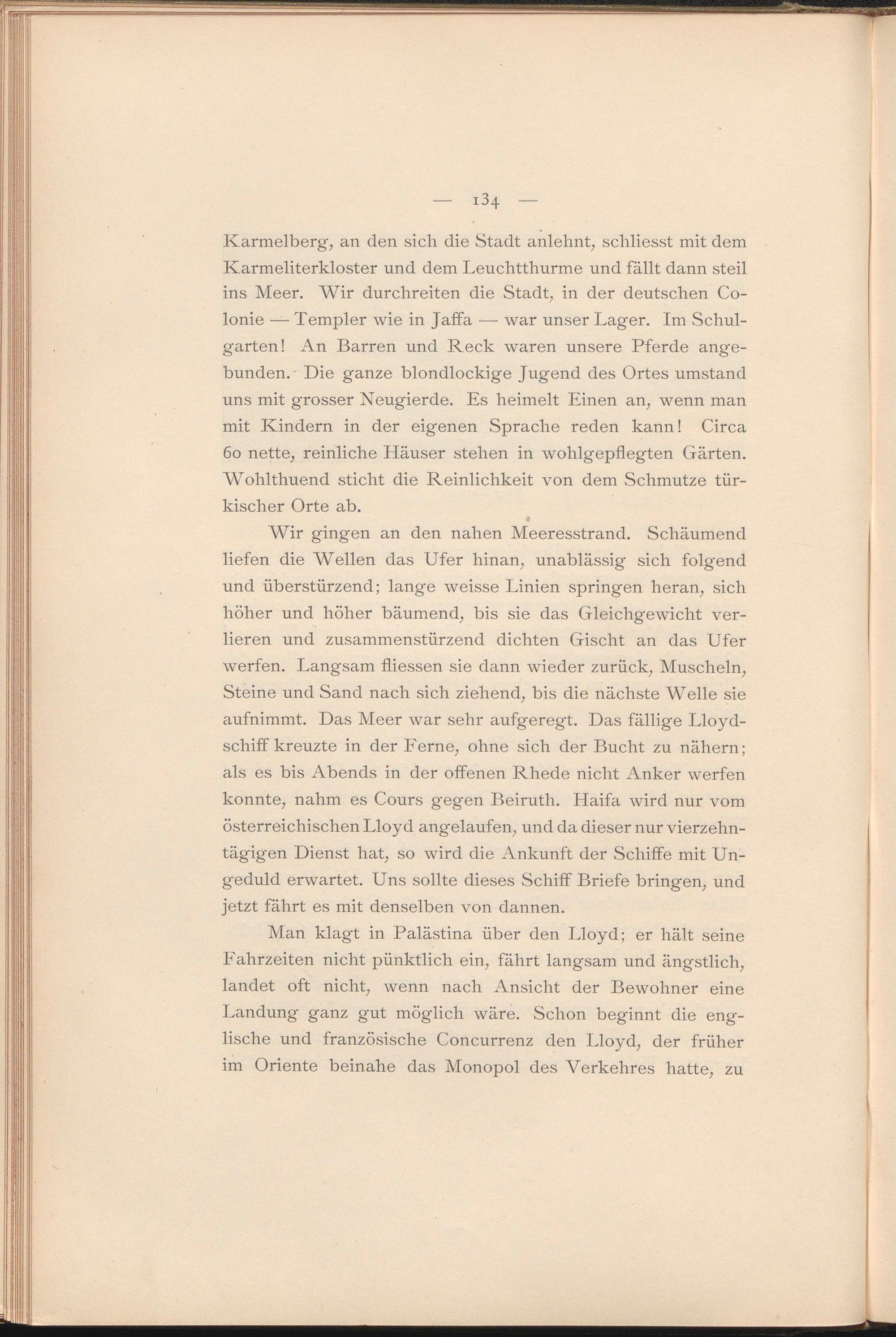 Wir gingen an den nahen Meeresstrand. Schäumend liefen die Wellen das Ufer hinan, unablässig sich folgend und überstürzend; lange weisse Linien springen heran, sich höher und höher bäumend, bis sie das Gleichgewicht verlieren und zusammenstürzend dichten Gischt an das Ufer werfen. Langsam fliessen sie dann wieder zurück, Muscheln, Steine und Sand nach sich ziehend, bis die nächste Welle sie aufnimmt. Das Meer war sehr aufgeregt. Das fällige Lloydschiff kreuzte in der Ferne, ohne sich der Bucht zu nähern; als es bis Abends in der offenen Rhede nicht Anker werfen konnte, nahm es Cours gegen Beiruth. Haifa wird nur vom österreichischen Lloyd angelaufen, und da dieser nur vierzehntägigen Dienst hat, so wird die Ankunft der Schiffe mit Ungeduld erwartet. Uns sollte dieses Schiff Briefe bringen, und jetzt fährt es mit denselben von dannen.