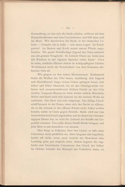 Karmelberg, an den sich die Stadt anlehnt, scliliesst mit dem Karmeliterkloster und dem Leuchtthurme und fällt dann steil ins Meer. Wir durchreiten die Stadt, in der deutschen Co- lonie — Templer wie in Jaffa — war unser Lager. Im Schulgarten! An Barren und Reck waren unsere Pferde angebunden. Die ganze blondlockige Jugend des Ortes umstand uns mit grosser Neugierde. Es heimelt Einen an, wenn man mit Kindern in der eigenen Sprache reden kann! Circa 60 nette, reinliche Pläuser stehen in wohlgepflegten Gärten. Wohlthuend sticht die Reinlichkeit von dem Schmutze türkischer Orte ab.