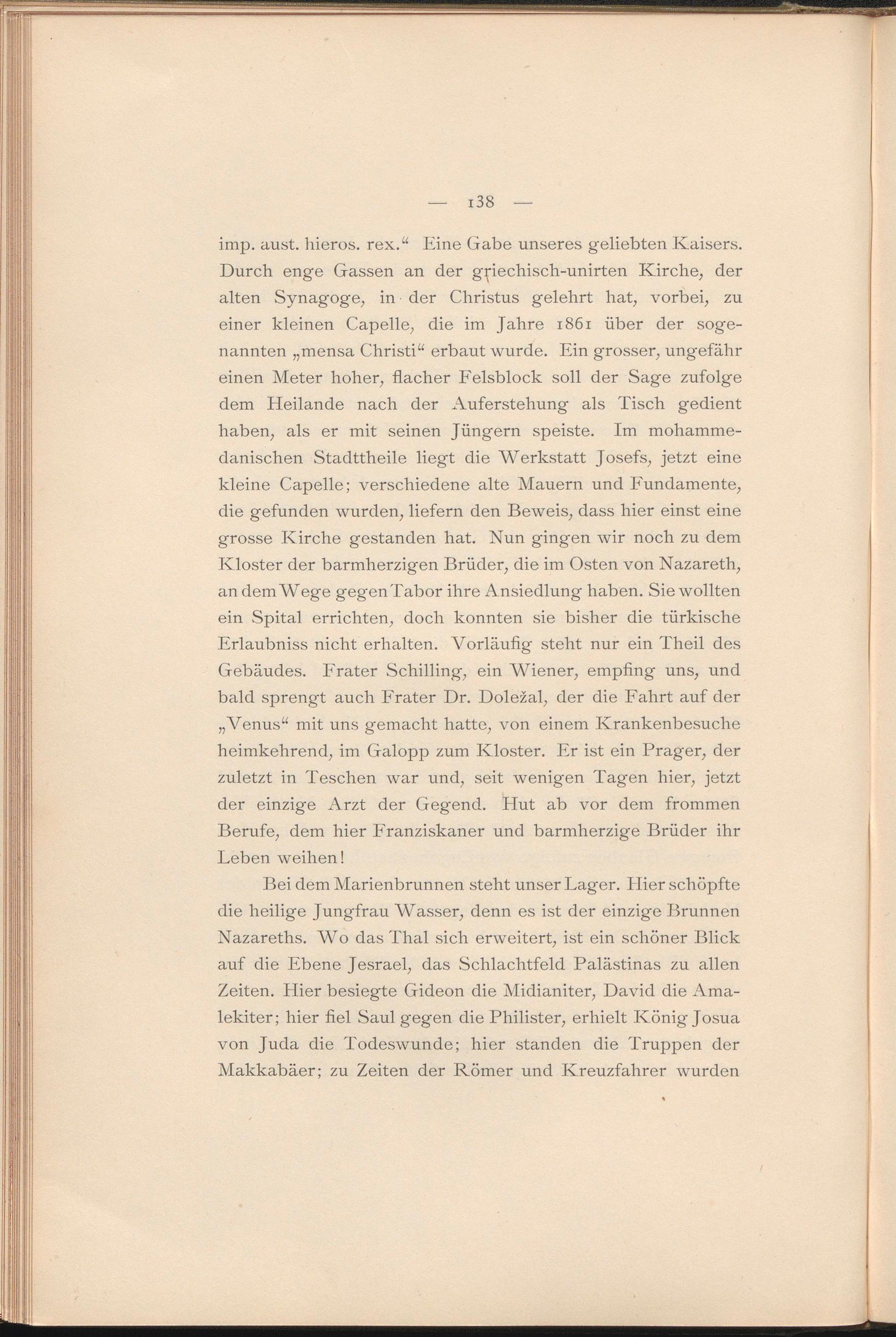 imp. aust. hieros. rex.“ Eine Gabe unseres geliebten Kaisers. Durch enge Gassen an der griechisch-unirten Kirche, der alten Synagoge, in der Christus gelehrt hat, vorbei, zu einer kleinen Capelle, die im Jahre 1861 über der sogenannten „mensa Christi“ erbaut wurde. Ein grosser, ungefähr einen Meter hoher, flacher Felsblock soll der Sage zufolge dem Heilande nach der Auferstehung als Tisch gedient haben, als er mit seinen Jüngern speiste. Im mohammedanischen Stadttheile liegt die Werkstatt Josefs, jetzt eine kleine Capelle; verschiedene alte Mauern und Fundamente, die gefunden wurden, liefern den Beweis, dass hier einst eine grosse Kirche gestanden hat. Nun gingen wir noch zu dem Kloster der barmherzigen Brüder, die im Osten von Nazareth, an dem Wege gegen Tabor ihre Ansiedlung haben. Sie wollten ein Spital errichten, doch konnten sie bisher die türkische Erlaubniss nicht erhalten. Vorläufig steht nur ein Theil des Gebäudes. Frater Schilling, ein Wiener, empfing uns, und bald sprengt auch Frater Dr. Dolezal, der die Fahrt auf der „Venus“ mit uns gemacht hatte, von einem Krankenbesuche heimkehrend, im Galopp zum Kloster. Er ist ein Prager, der zuletzt in Teschen war und, seit wenigen Tagen hier, jetzt der einzige Arzt der Gegend. Flut ab vor dem frommen Berufe, dem hier Franziskaner und barmherzige Brüder ihr Leben weihen!