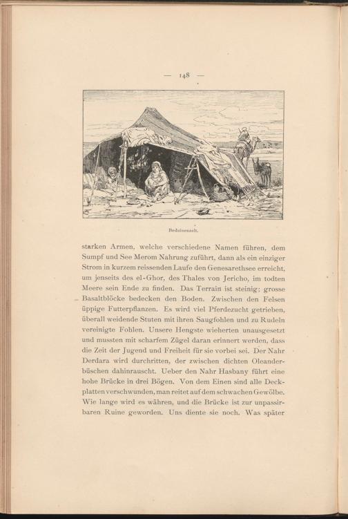 starken Armen, welche verschiedene Namen führen, dem Sumpf und See Merom Nahrung zuführt, dann als ein einziger Strom in kurzem reissenden Laufe den Genesarethsee erreicht, um jenseits des el-Ghor, des Thaies von Jericho, im todten Meere sein Ende zu finden. Das Terrain ist steinig; grosse Basaltblöcke bedecken den Boden. Zwischen den Felsen üppige Futterpflanzen. Es wird viel Pferdezucht getrieben, überall weidende Stuten mit ihren Saugfohlen und zu Rudeln vereinigte Fohlen. Unsere Hengste wieherten unausgesetzt und mussten mit scharfem Zügel daran erinnert werden, dass die Zeit der Jugend und Freiheit für sie vorbei sei. Der Nähr Derdara wird durchritten, der zwischen dichten Oleanderbüschen dahinrauscht. Ueber den Nähr Hasbany führt eine hohe Brücke in drei Bögen. Von dem Einen sind alle Deckplattenverschwunden, man reitet auf dem schwachen Gewölbe. Wie lange wird es währen, und die Brücke ist zur unpassir- baren Ruine geworden. Uns diente sie noch. Was später