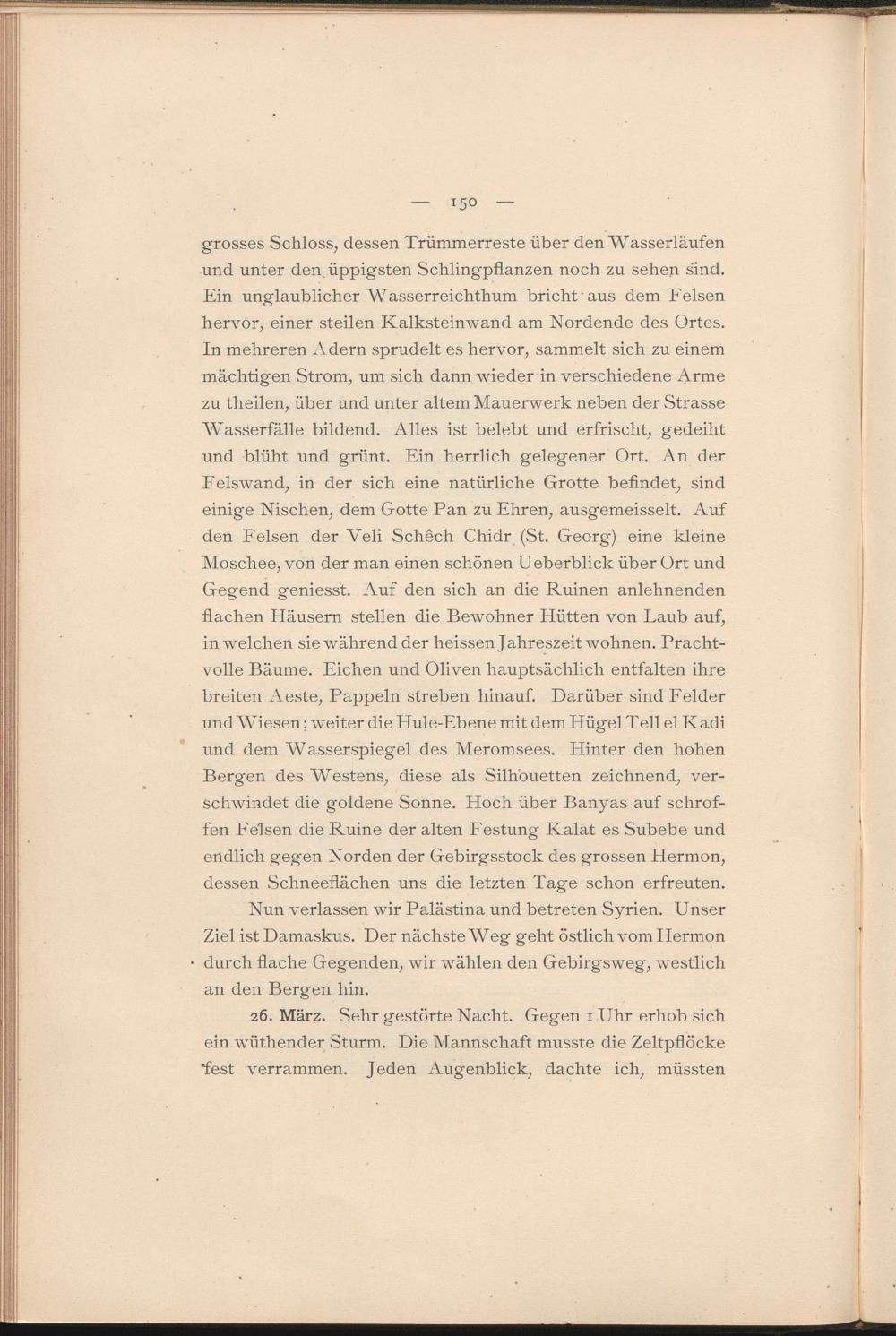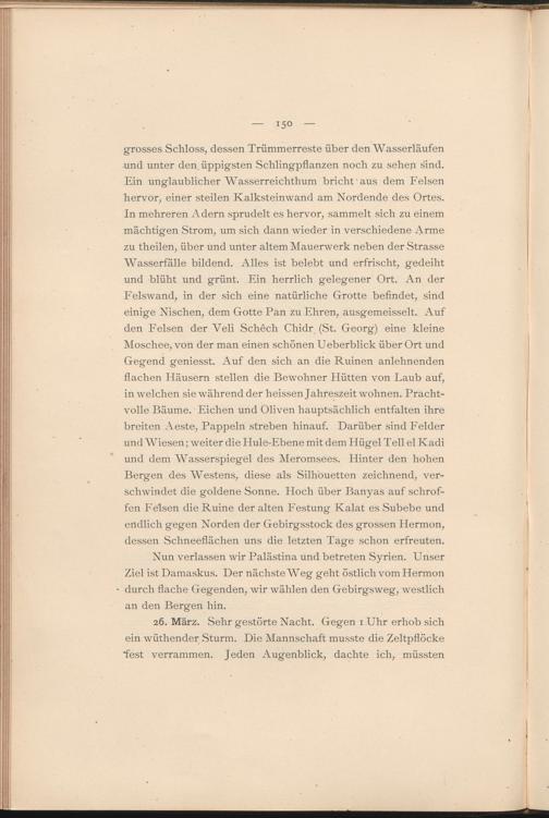 grosses Schloss, dessen Trümmerreste über den Wasserläufen ■und unter den üppigsten Schlingpflanzen noch zu sehen sind. Ein unglaublicher Wasserreichthum bricht aus dem Felsen hervor, einer steilen Kalksteinwand am Nordende des Ortes. In mehreren Adern sprudelt es hervor, sammelt sich zu einem mächtigen Strom, um sich dann wieder in verschiedene Arme zu theilen, über und unter altem Mauerwerk neben der Strasse Wasserfälle bildend. Alles ist belebt und erfrischt, gedeiht und blüht und grünt. Ein herrlich gelegener Ort. An der Felswand, in der sich eine natürliche Grotte befindet, sind einige Nischen, dem Gotte Pan zu Ehren, ausgemeisselt. Auf den Felsen der Yeli Schech Chidr (St. Georg) eine kleine Moschee, von der man einen schönen Ueberblick über Ort und Gegend geniesst. Auf den sich an die Ruinen anlehnenden flachen Häusern stellen die Bewohner Hütten von Laub auf, in welchen sie während der heissen Jahreszeit wohnen. Prachtvolle Bäume. Eichen und Oliven hauptsächlich entfalten ihre breiten Aeste, Pappeln streben hinauf. Darüber sind Felder und Wiesen; weiter die Hule-Ebene mit dem Hügel Teil el Kadi und dem Wasserspiegel des Meromsees. Hinter den hohen Bergen des Westens, diese als Silhouetten zeichnend, verschwindet die goldene Sonne. Hoch über Banyas auf schroffen Felsen die Ruine der alten Festung Kalat es Subebe und endlich gegen Norden der Gebirgsstock des grossen Hermon, dessen Schneeflächen uns die letzten Tage schon erfreuten.