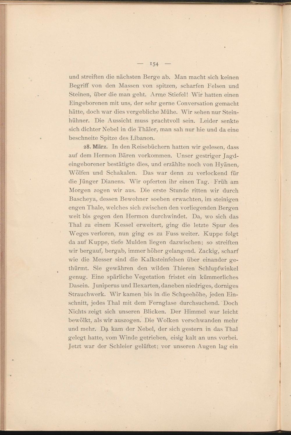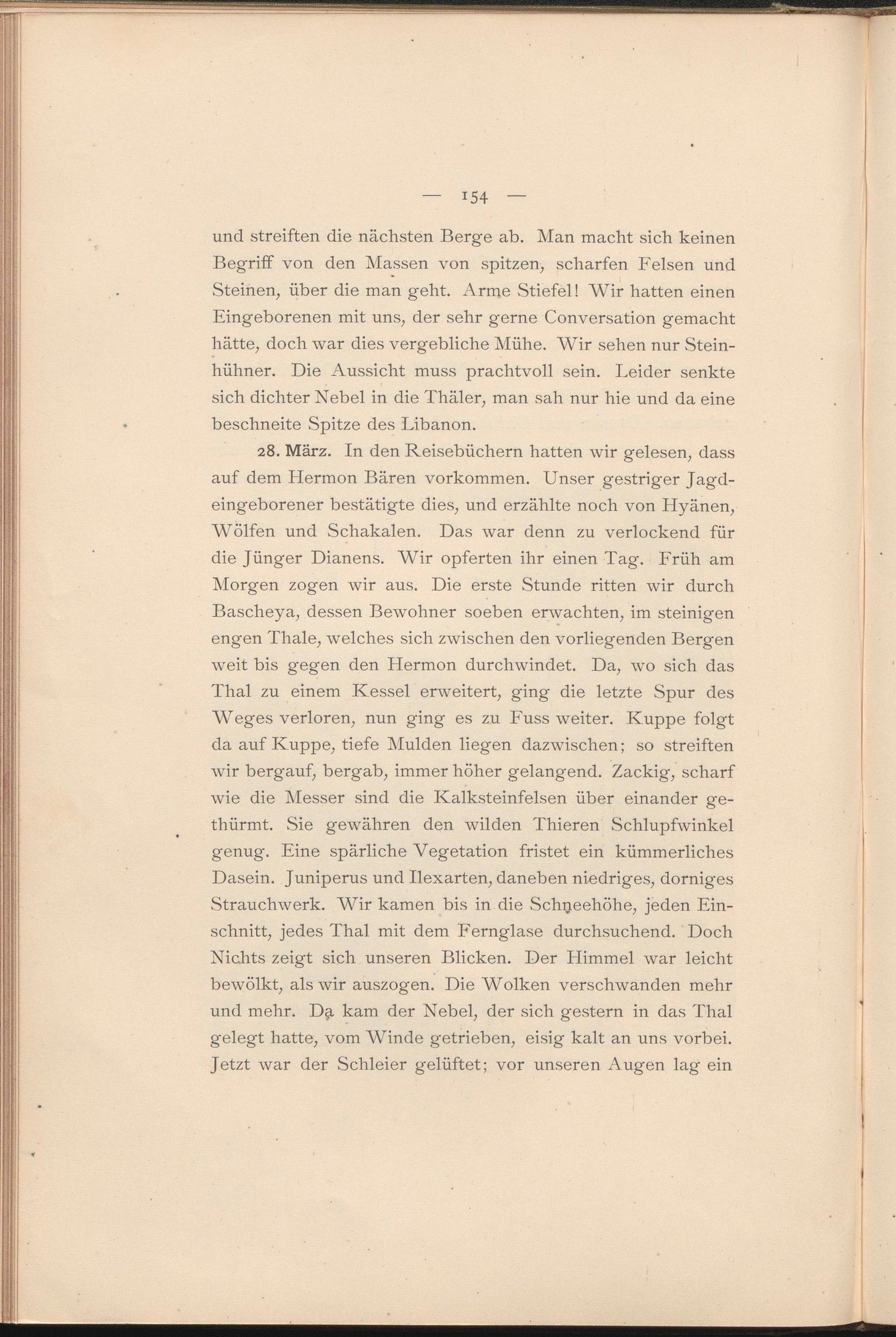 28. März. In den Reisebüchern hatten wir gelesen, dass auf dem Hermon Bären Vorkommen. Unser gestriger Jagdeingeborener bestätigte dies, und erzählte noch von Hyänen, Wölfen und Schakalen. Das war denn zu verlockend für die Jünger Dianens. Wir opferten ihr einen Tag. Früh am Morgen zogen wir aus. Die erste Stunde ritten wir durch Bascheya, dessen Bewohner soeben erwachten, im steinigen engen Thale, welches sich zwischen den vorliegenden Bergen weit bis gegen den Hermon durchwindet. Da, wo sich das Thal zu einem Kessel erweitert, ging die letzte Spur des Weges verloren, nun ging es zu Fuss weiter. Kuppe folgt da auf Kuppe, tiefe Mulden liegen dazwischen; so streiften wir bergauf, bergab, immer höher gelangend. Zackig, scharf wie die Messer sind die Kalksteinfelsen über einander ge- thürmt. Sie gewähren den wilden Thieren Schlupfwinkel genug. Eine spärliche Vegetation fristet ein kümmerliches Dasein. Juniperus und Ilexarten, daneben niedriges, dorniges Strauchwerk. Wir kamen bis in die Schneehöhe, jeden Einschnitt, jedes Thal mit dem Fernglase durchsuchend. Doch Nichts zeigt sich unseren Blicken. Der LIimmel war leicht bewölkt, als wir auszogen. Die Wolken verschwanden mehr und mehr. Dg. kam der Nebel, der sich gestern in das Thal gelegt hatte, vom Winde getrieben, eisig kalt an uns vorbei. Jetzt war der Schleier gelüftet; vor unseren Augen lag ein
