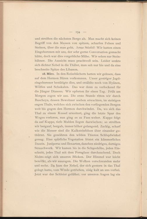 und streiften die nächsten Berge ab. Man macht sich keinen Begriff von den Massen von spitzen, scharfen Felsen und Steinen, über die man geht. Arme Stiefel! Wir hatten einen Eingeborenen mit uns, der sehr gerne Conversation gemacht hätte, doch war dies vergebliche Mühe. Wir sehen nur Steinhühner. Die Aussicht muss prachtvoll sein. Leider senkte sich dichter Nebel in die Thäler, man sah nur hie und da eine beschneite Spitze des Libanon.