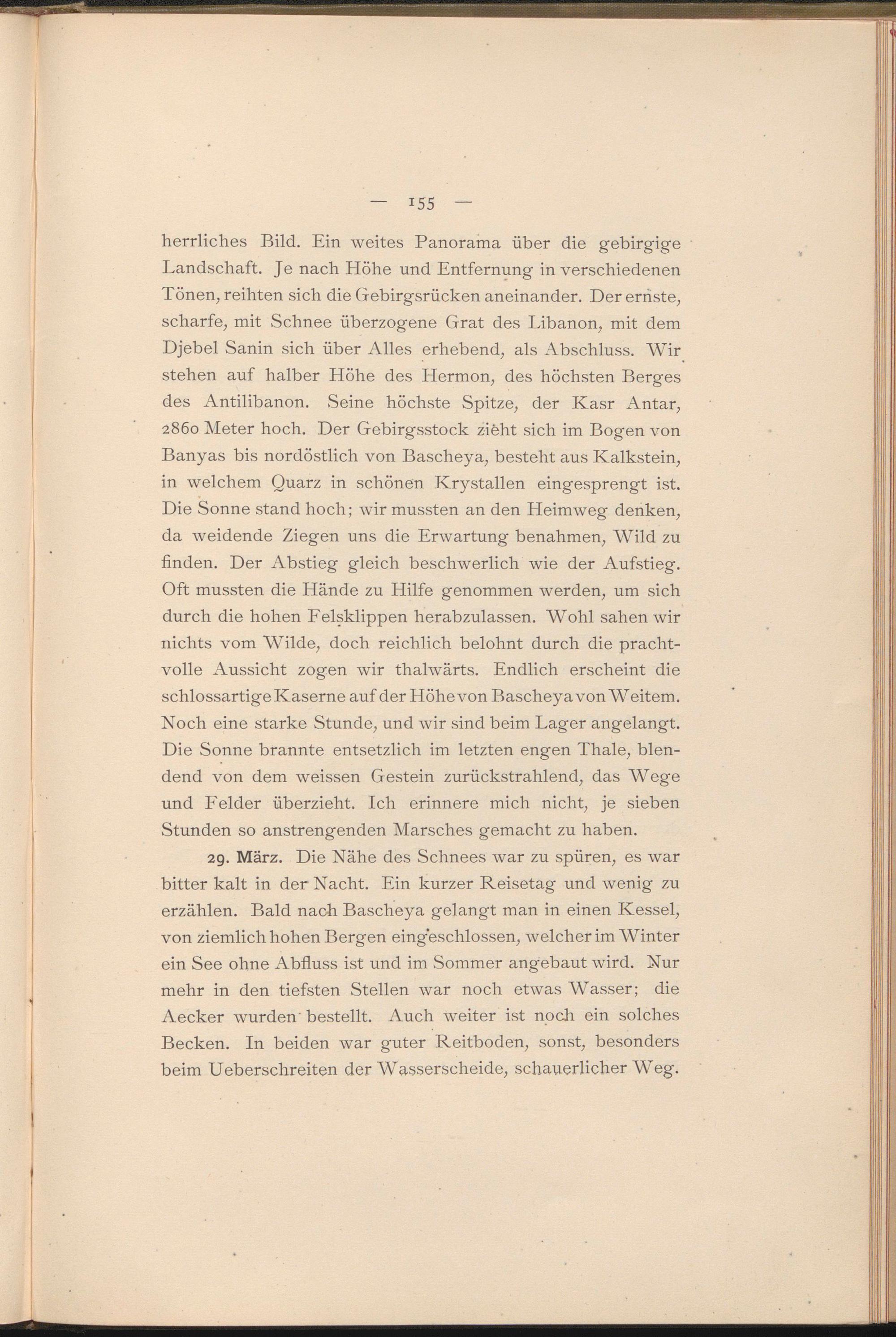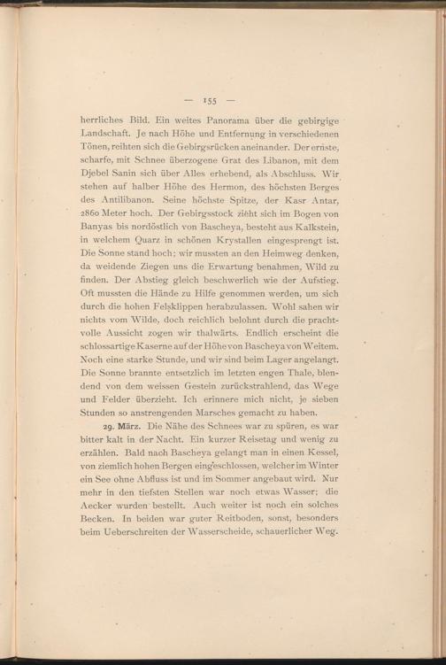 herrliches Bild. Ein weites Panorama über die gebirgige Landschaft. Je nach Höhe und Entfernung in verschiedenen Tönen, reihten sich die Gebirgsrücken aneinander. Der ernste, scharfe, mit Schnee überzogene Grat des Libanon, mit dem Djebel Sanin sich über Alles erhebend, als Abschluss. Wir stehen auf halber Höhe des Hermon, des höchsten Berges des Antilibanon. .Seine höchste Spitze, der Kasr Antar, 2860 Meter hoch. Der Gebirgsstock zifeht sich im Bogen von Banyas bis nordöstlich von Bascheya, besteht aus Kalkstein, in welchem Quarz in schönen Krystallen eingesprengt ist. Die Sonne stand hoch; wir mussten an den Heimweg denken, da weidende Ziegen uns die Erwartung benahmen, Wild zu finden. Der Abstieg gleich beschwerlich wie der Aufstieg. Oft mussten die Hände zu Hilfe genommen werden, um sich durch die hohen Felsklippen herabzulassen. Wohl sahen wir nichts vom Wilde, doch reichlich belohnt durch die prachtvolle Aussicht zogen wir thalwärts. Endlich erscheint die schlossartige Kaserne auf der Höhevon Bascheya von Weitem. Noch eine starke Stunde, und wir sind beim Lager angelangt. Die Sonne brannte entsetzlich im letzten engen Thale, blendend von dem weissen Gestein zurückstrahlend, das AVege und Felder überzieht. Ich erinnere mich nicht, je sieben Stunden so anstrengenden Alarsches gemacht zu haben.