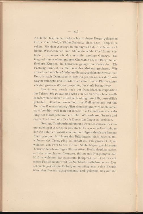 Die Strasse wurde nach der französischen Expedition des Jahres 1860 gebaut und wird von der französischen Gesellschaft, welche auch die Postverbindung unterhält, vortrefflich gehalten. Blendend weiss liegt der Kalksteinstaub auf ihr. Der alte Karawanenweg führt daneben und wird noch immer stark benützt, weil man auf diesem die Saumthiere der Zahlung der Mauthgebühren entzieht. Wir verlassen Strasse und enges Thal, um beim Dorfe Dimas das Lager zu beziehen.
