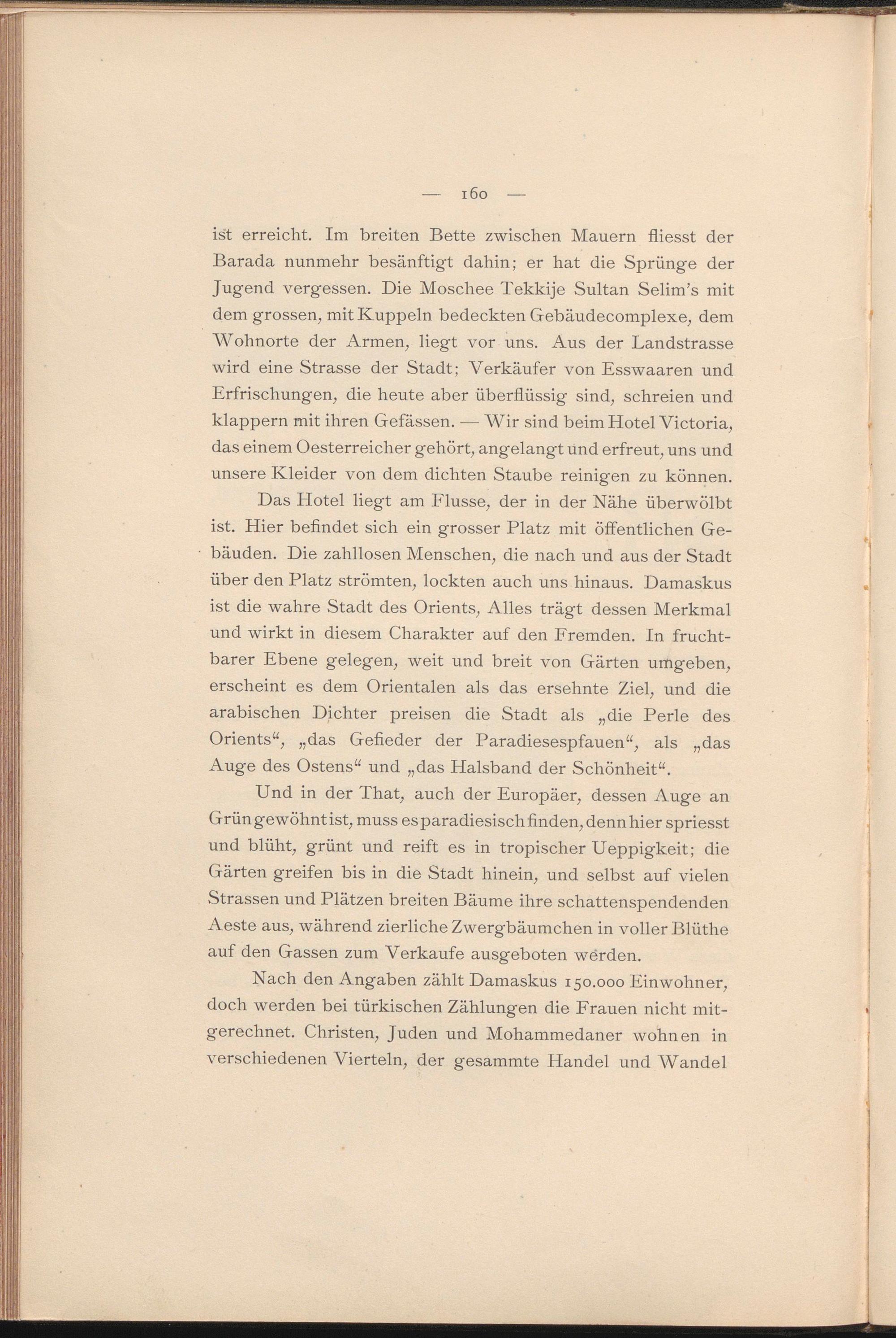 Das Hotel liegt am Flusse, der in der Nähe überwölbt ist. Hier befindet sich ein grosser Platz mit öffentlichen Gebäuden. Die zahllosen Menschen, die nach und aus der Stadt über den Platz strömten, lockten auch uns hinaus. Damaskus ist die wahre Stadt des Orients, Alles trägt dessen Merkmal und wirkt in diesem Charakter auf den Fremden. In fruchtbarer Ebene gelegen, weit und breit von Gärten umgeben, erscheint es dem Orientalen als das ersehnte Ziel, und die arabischen Dichter preisen die .Stadt als „die Perle des Orients“, „das Gefieder der Paradiesespfauen“, als „das Auge des Ostens“ und „das Halsband der Schönheit“.