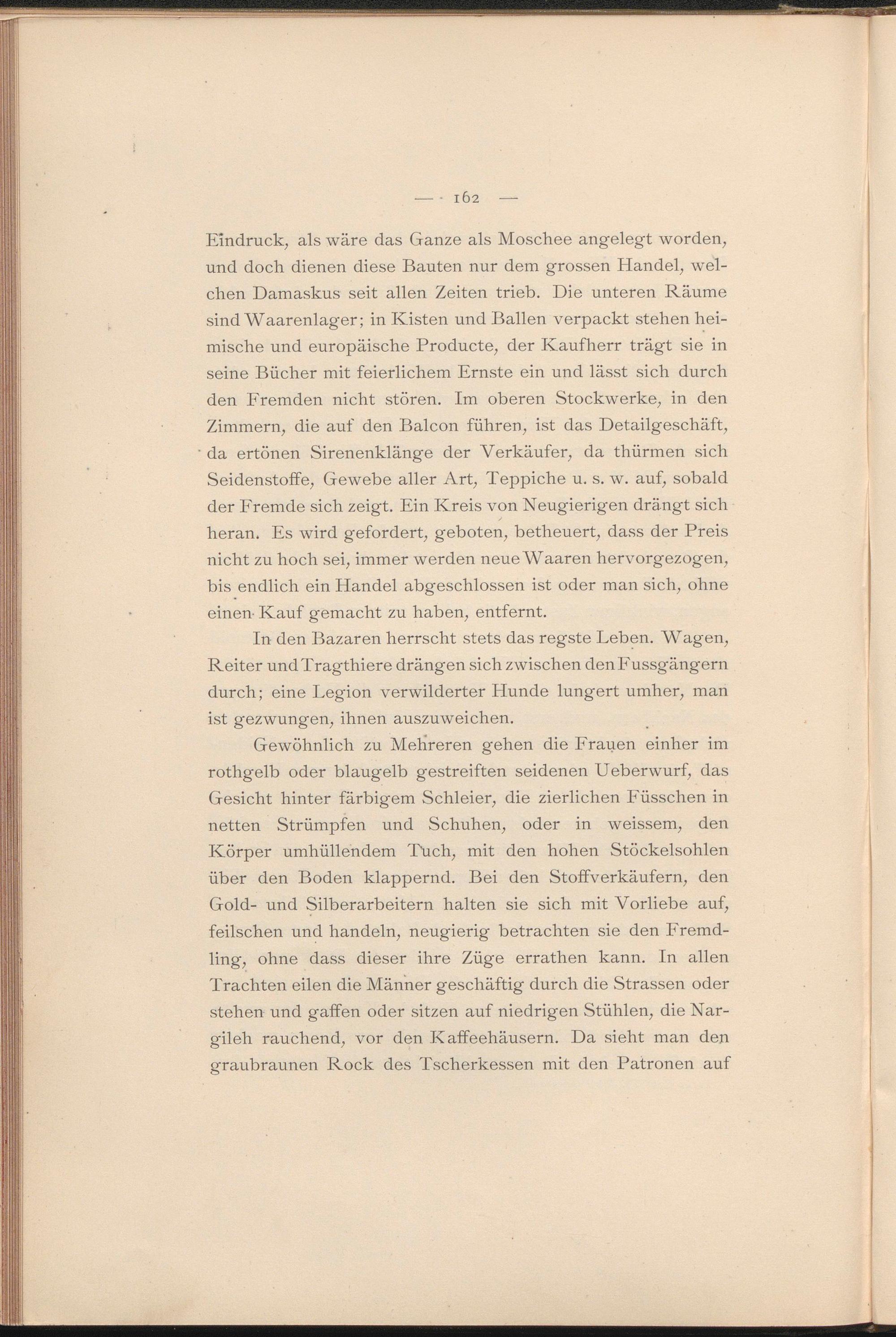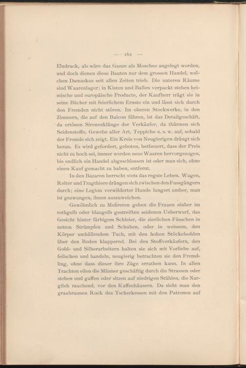 Eindruck, als wäre das Ganze als Moschee angelegt worden, und doch dienen diese Bauten nur dem grossen Handel, welchen Damaskus seit allen Zeiten trieb. Die unteren Räume sind Waarenlager; in Kisten und Ballen verpackt stehen heimische und europäische Producte, der Kaufherr trägt sie in seine Bücher mit feierlichem Ernste ein und lässt sich durch den Fremden nicht stören. Im oberen Stockwerke, in den Zimmern, die auf den Balcon führen, ist das Detailgeschäft, da ertönen Sirenenklänge der Verkäufer, da thürmen sich Seidenstoffe, Gewebe aller Art, Teppiche u. s. w. auf, sobald der Fremde sich zeigt. Ein Kreis von Neugierigen drängt sich heran. Es wird gefordert, geboten, betheuert, dass der Preis nicht zu hoch sei, immer werden neue Waaren hervorgezogen, bis endlich ein Handel abgeschlossen ist oder man sich, ohne einen- Kauf gemacht zu haben, entfernt.